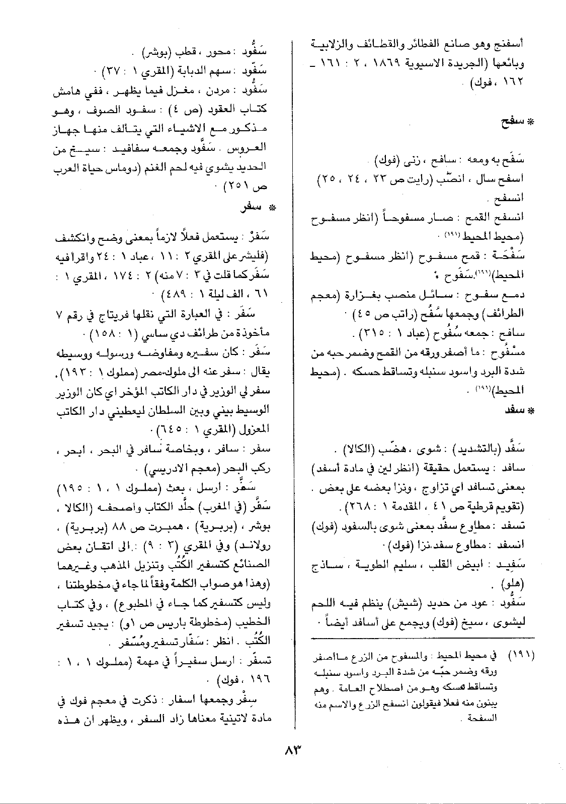 • سفر: سَفرْ: يستعمل فعلاً لازماً بمعنى وضح وانكشف (فليشر على المقري 2: 11، عباد 1: 24 واقرأ فيه سَفَر كما قلت في 3: 7 منه) 2: 174، المقري 1: 61، ألف ليلة 1: 489).