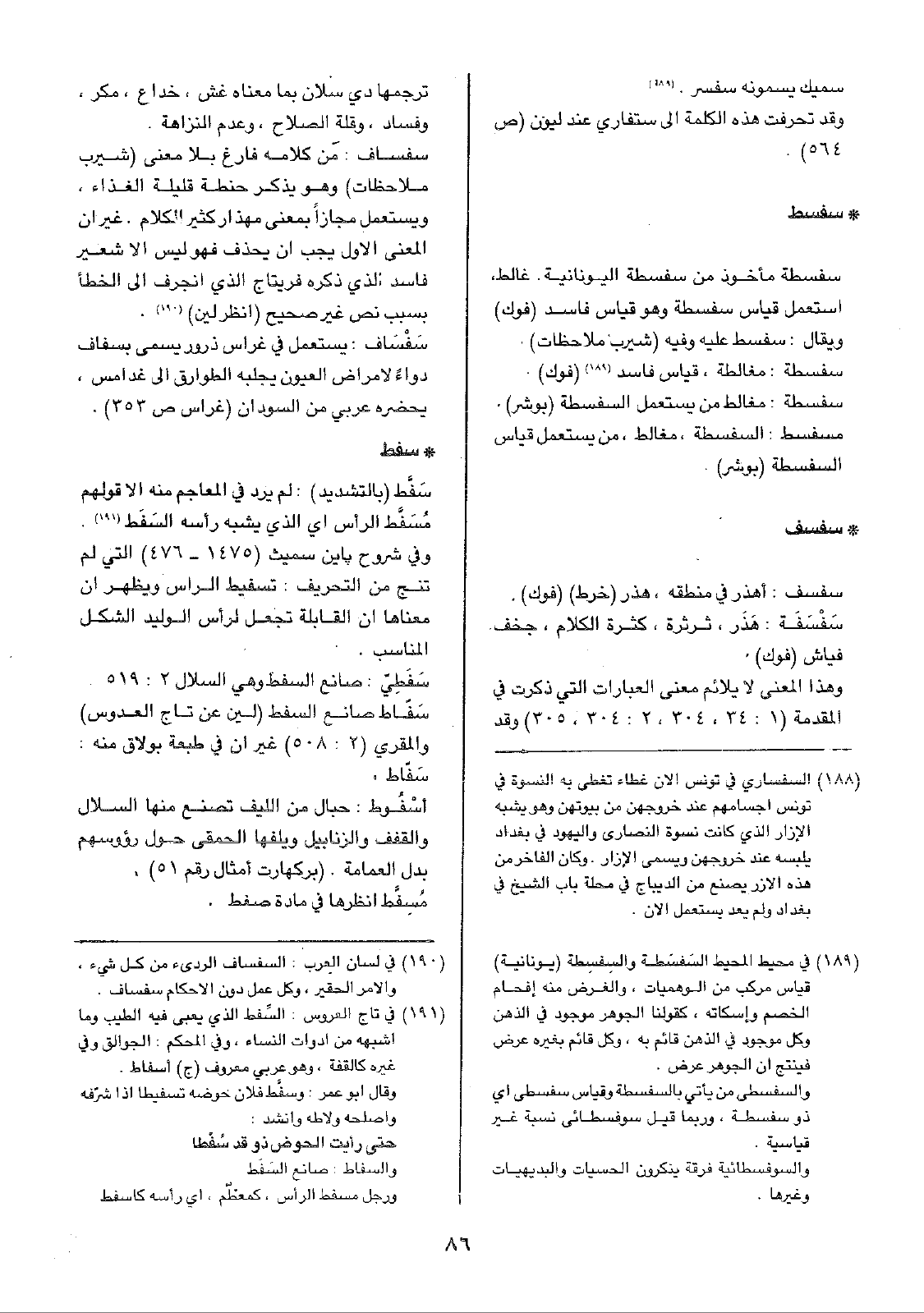 سفساف: من كلامه فارغ بلا معنى (شيرب ملاحظات) وهو يذكر حنطة قليلة الغذاء، ويستعمل مجازاً بمعنى مهذار كثير الكلام. غير أن المعنى الأول يجب أن يحذف فهو ليس إلا شعير فاسد الذي ذكره فريتاج الذي انجرف إلى الخطأ بسبب نص غير صحيح (انظر لين).