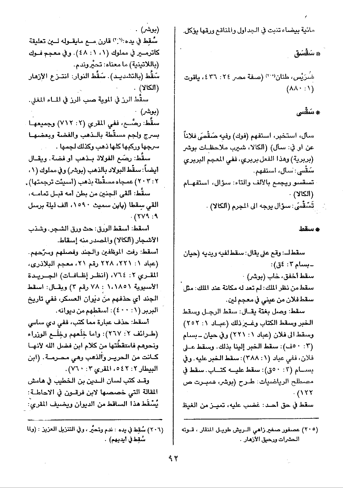 سقط: وثل بغتة يقال: سقط الرجل وسقط الخبر وسقط الكتاب وغير ذلك (عباد 1: 252) وسقط إلى فلان (عباد 1: 221) وفي حيان - بسام (3: 50ف): سقط الخبر إلينا بذلك. وسقط على فلان، ففي عباد (1: 388): سقط الخبر عليه. وفي بسام (3: 50 ق): سقط عليه كتاب. سقط في مصطلح الرياضيات: طرح (بوشر، همبرت ص122).
