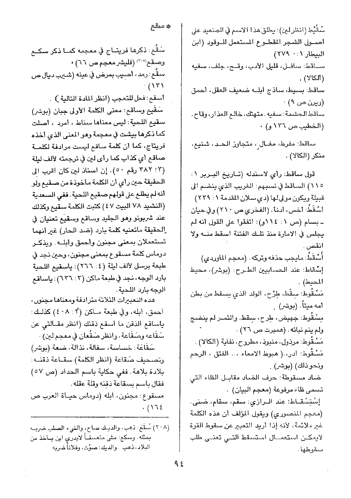 سقيع اللحية: ليس معناها سناط، أمرد، أصلت كما ذكرها بيشت في معجمة وهو المعنى الذي أخذه فريتاج، كما أن كلمة ساقع ليست مرادفة لكلمة صاقع أي كذاب كما رأى لين في ترجمته لألف ليلة (3؛ 382 رقم 50). إن أستاذ لين كان أقرب إلى الحقيقة حين رأي أن الكلمة مأخوذة من صقيع ولو إنه لم يطلع على قولهم صقيع اللحية. ففي السعدية (النشيد 78 البيت 47) كتبت الكلمة سقيع وكذلك عند شربرنو وهو الجليد وساقع وهو الجليد وساقع وسقيع تعنيان في الحقيقة ما تعنيه كلمة بارد (ضد الحار) غير أنهما تستعملان بمعنى مجنون وأحمق وأبله. ويذكر دوماس كلمة مسقوع بمعنى مجنون، وحين نجد في طبعة برسل لألف ليلة (4: 266): يا سقيع اللحية بارد الوجه، نجد في طبعة ماكن (3: 636): يا ساقع الوجه بارد اللحية.