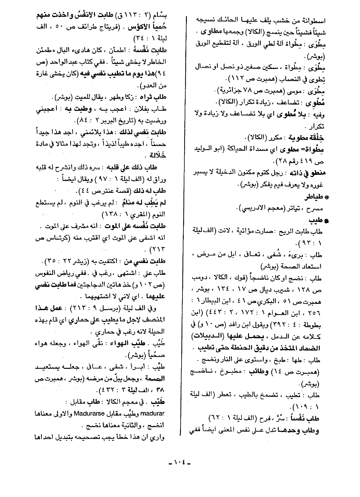 طاب نَفْساً: سُرَّ، فرح (ألف ليلة 1: 62) وطاب وحدها تدل على نفس المعنى أيضاً ففي بسّام (2: 113ق) طابت الأنفْسُ وأخذت منهم حُمياً الأكؤس. (فريتاج طرائف ص50، ألف ليلة 1: 34).