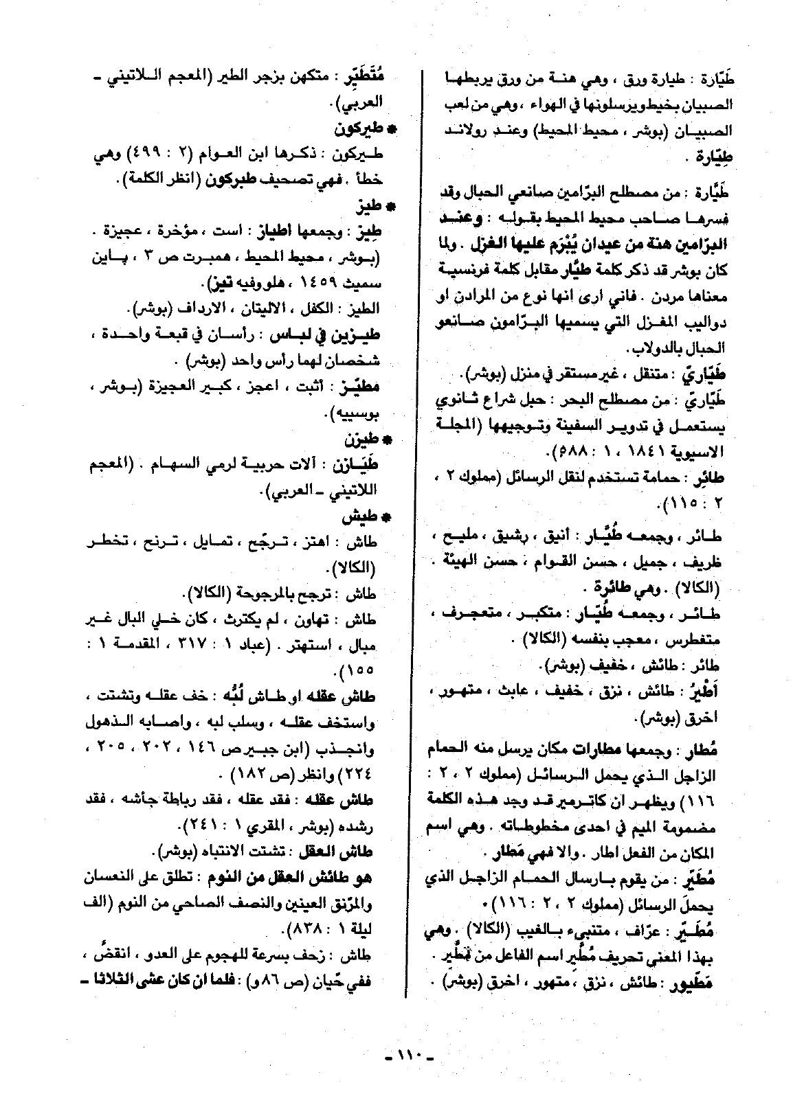 طَيَّارة: من مصطلح البرّامين صانعي الحبال وقد فسرها صاحب محيط المحيط بقوله: وعند البرّامين هنة من عيدان يُبْرَم عليها الغزل. ولما كان بوشر قد ذكر كلمة طيَّار مقابل كلمة فرنسية معناها مردن. فإني أرى إنها نوع من المرادن أو دواليب المغزل التي يسميها البرّامون صانعو الحبال بالدولاب.