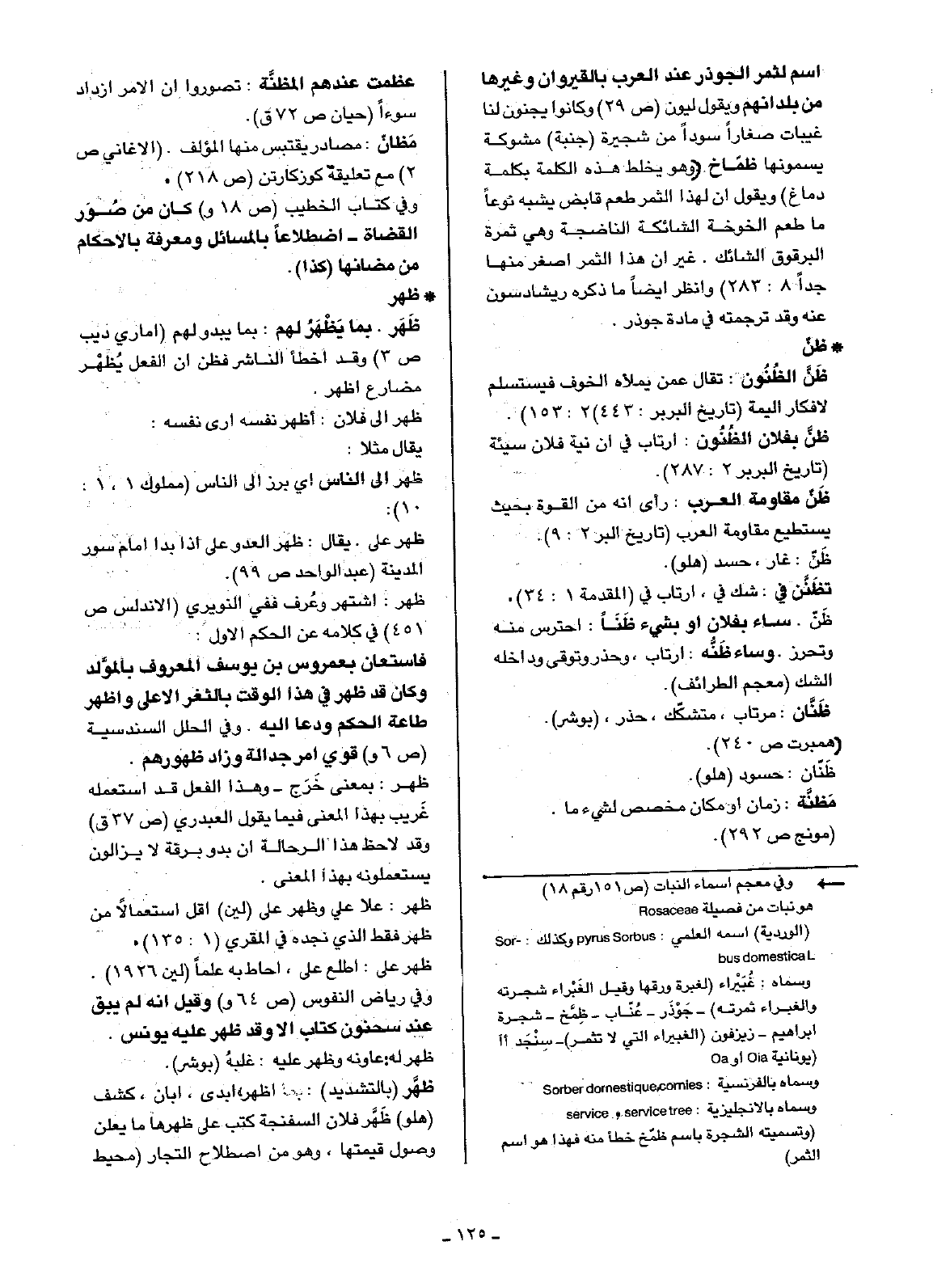 • ظنّ: ظّنَّ الظُنُون: تقال عمن يملأه الخوف فيستسلم لأفكار أليمة (تاريخ البربر: 443، 2: 153).
