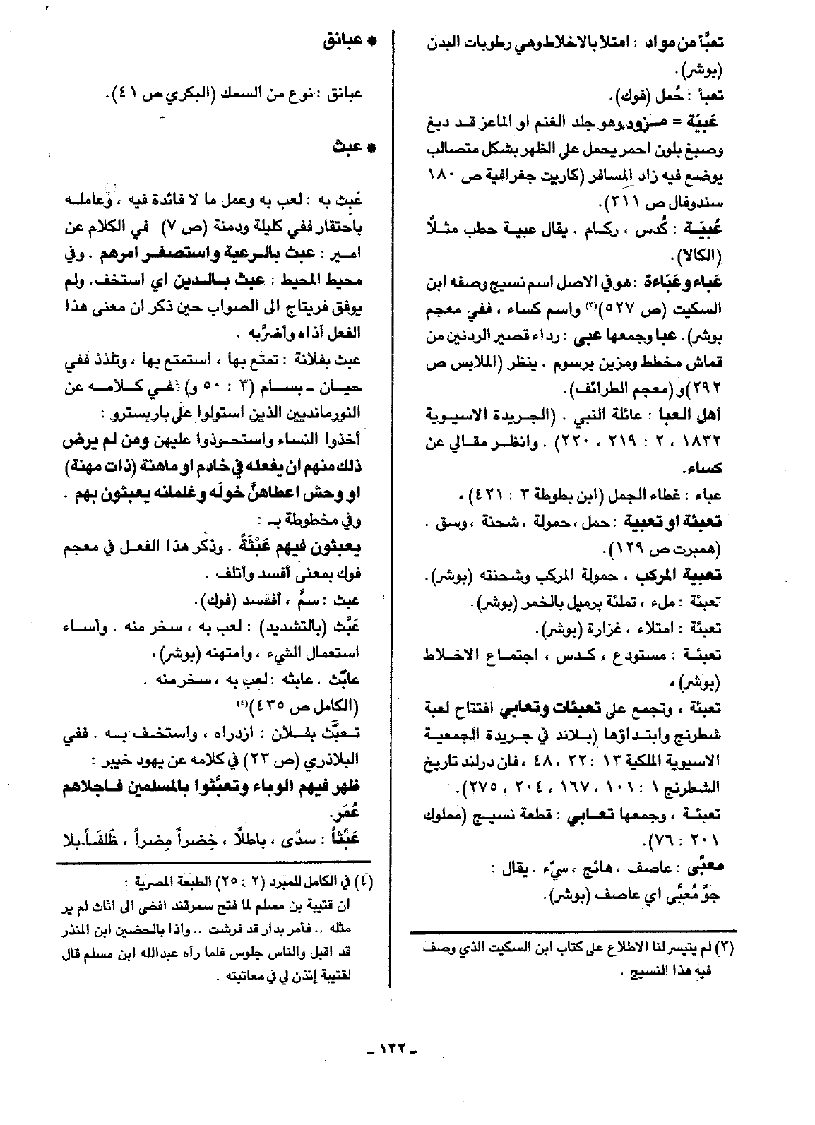 • عبث: عَبِث به: لعب به وعمل ما لا فائدة فيه، وعامله باحتقار ففي كليلة ودمنة (ص7) في الكلام عن امير: عبث بالرعية واستصغر أمرهم. وفي محيط المحيط: عبث بالدين أي استخف. ولم يوفق فريتاج إلى الصواب حين ذكر أن معنى هذا الفعل آذاه وأضرَّ به.