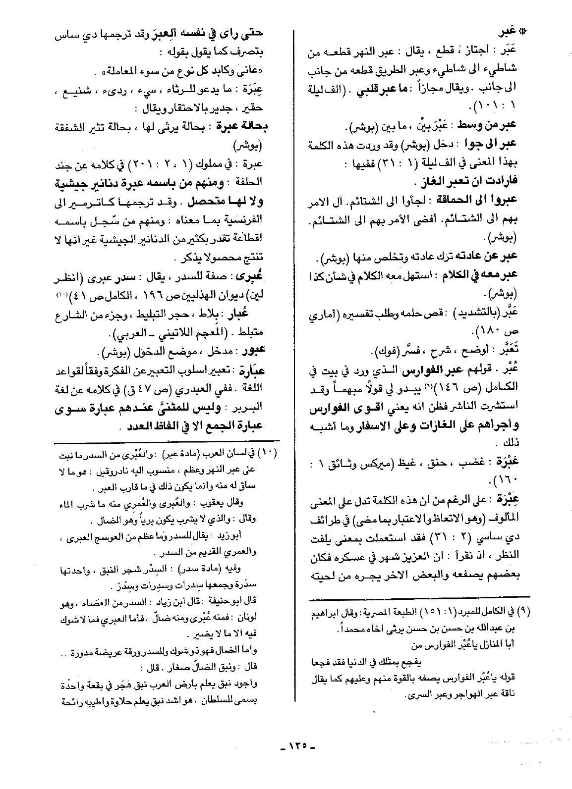 عُبْر. قولهم عبر الفوارس الذي ورد في بيت في الكامل (ص146) يبدو لي قولاً مبهماً وقد استشرت الناشر فظن إنه يعني أقوى الفوارس وأجراهم على الغارات وعلى الاسفار وما أشبه ذلك.