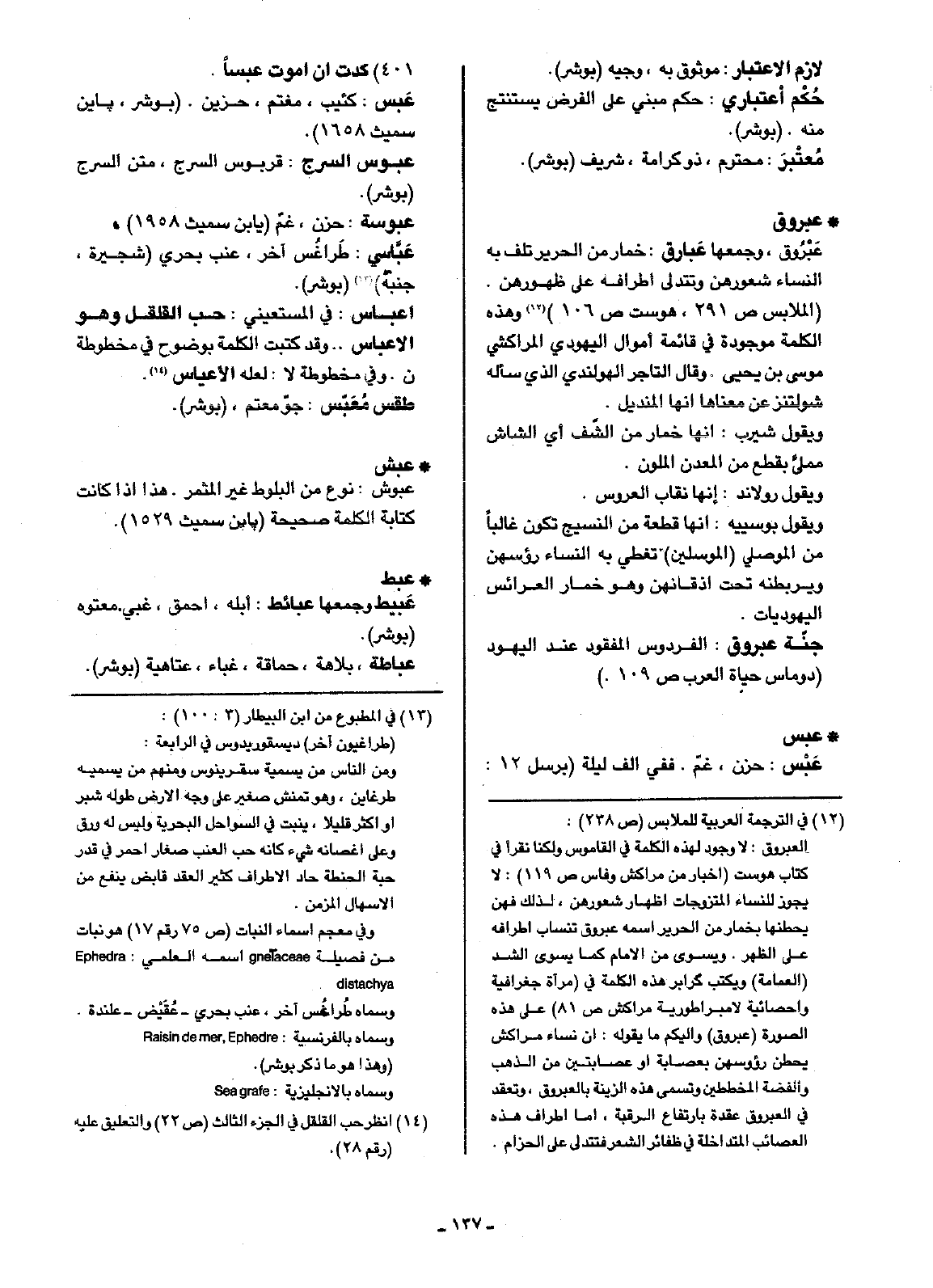 • عبروق: عَبْرُوق، وجمعها عَبارق: خمار من الحرير تلف به النساء شعورهن وتتدلى أطرافه على ظهورهن. (الملابس ص291، هوست ص106) وهذه الكلمة موجودة في قائمة أموال اليهودي المراكشي موسى بن يحيى. وقال التاجر الهولندي الذي سأله شولتنز عن معناها إنها المنديل.