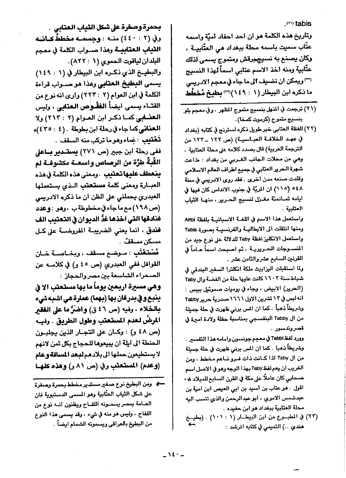 ففي رحلة ابن جبير (ص271) يستدير بأعلى القُبةَّ طرَّة من الرصاص واسعة مكشوفة لم ينعطف عليها تعتيب. ومعنى هذه الكلمة في هذه العبارة ومعنى كلمة مستعتب الذي يستعملها العبدري يحملني على الظن أن ما ذكره الادريسي (ص198) مع ما جاء في مخطوطة ب، وهو: وعدد فنادقها التي أخذها عَدُّ الديوان في التعتيب ألف فندق، إنما يعني الضريبة المفروضة على كل مسكن مسقف.