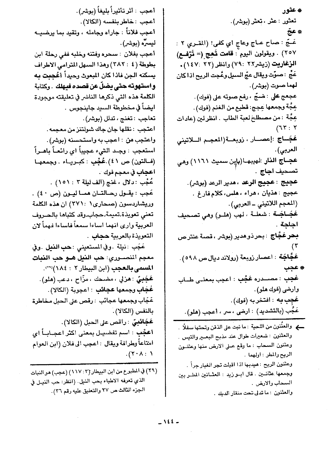 استعجب: وجد الشيء عجيباً أي رائعاً باهراً (فالتون ص41) عُجْب: كبرياء. وجمعها إعجاب في معجم فوك.