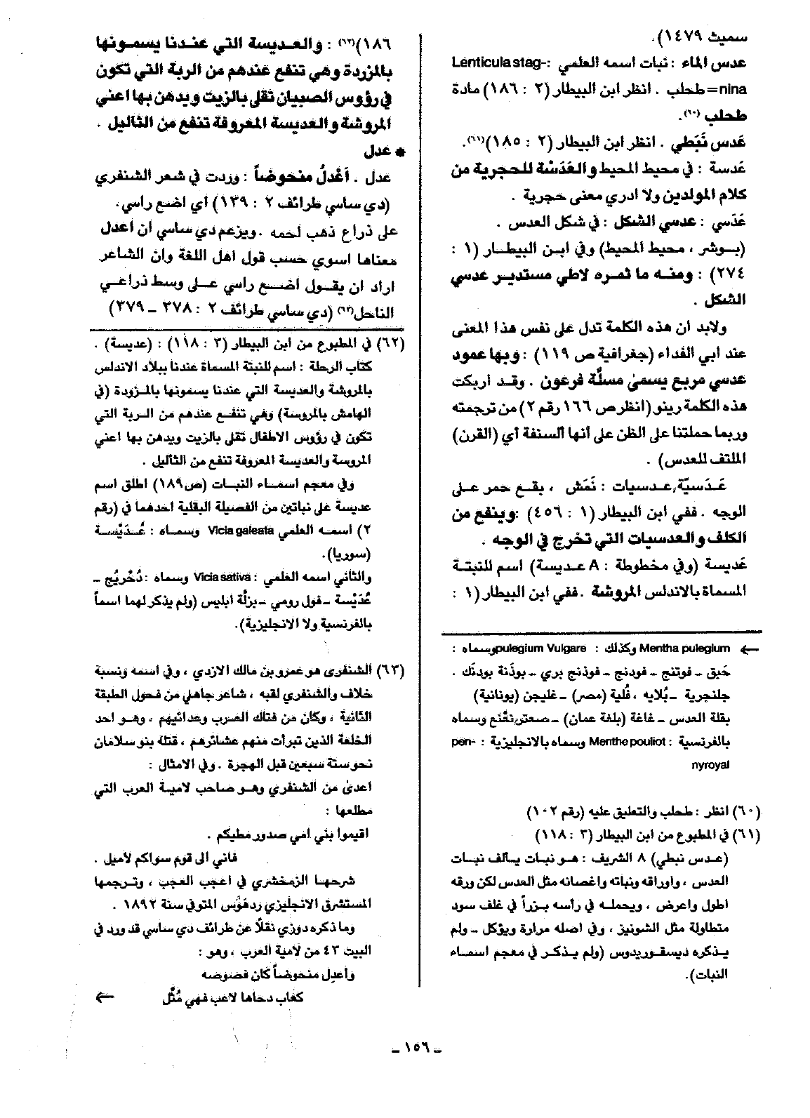 عدس الماء: نبات اسمه العلمي:- Lenticula stag nina= طحلب. انظر ابن البيطار (2: 186) مادة طحلب.