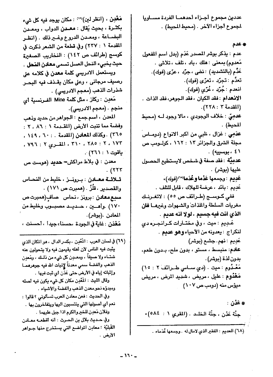 • عَدْن: جنَّة عَدْن، جنَّة الخلد. (المقري 1: 584)، مَعْدِن، (انظر لين): مكان يوجد فيه كل شيء بكثرة، بحيث يقال: معدن الدوا، ومعدن البضاعة، ومعدن الدروع وغير ذلك. (انظر المقدمة 1: 237) وفي قطعة من الشعر ذكرت في كوسج (طرائف ص142): النخاريب الصغيرة حيث يخبئ النحل العسل تسمى معادن النحل.