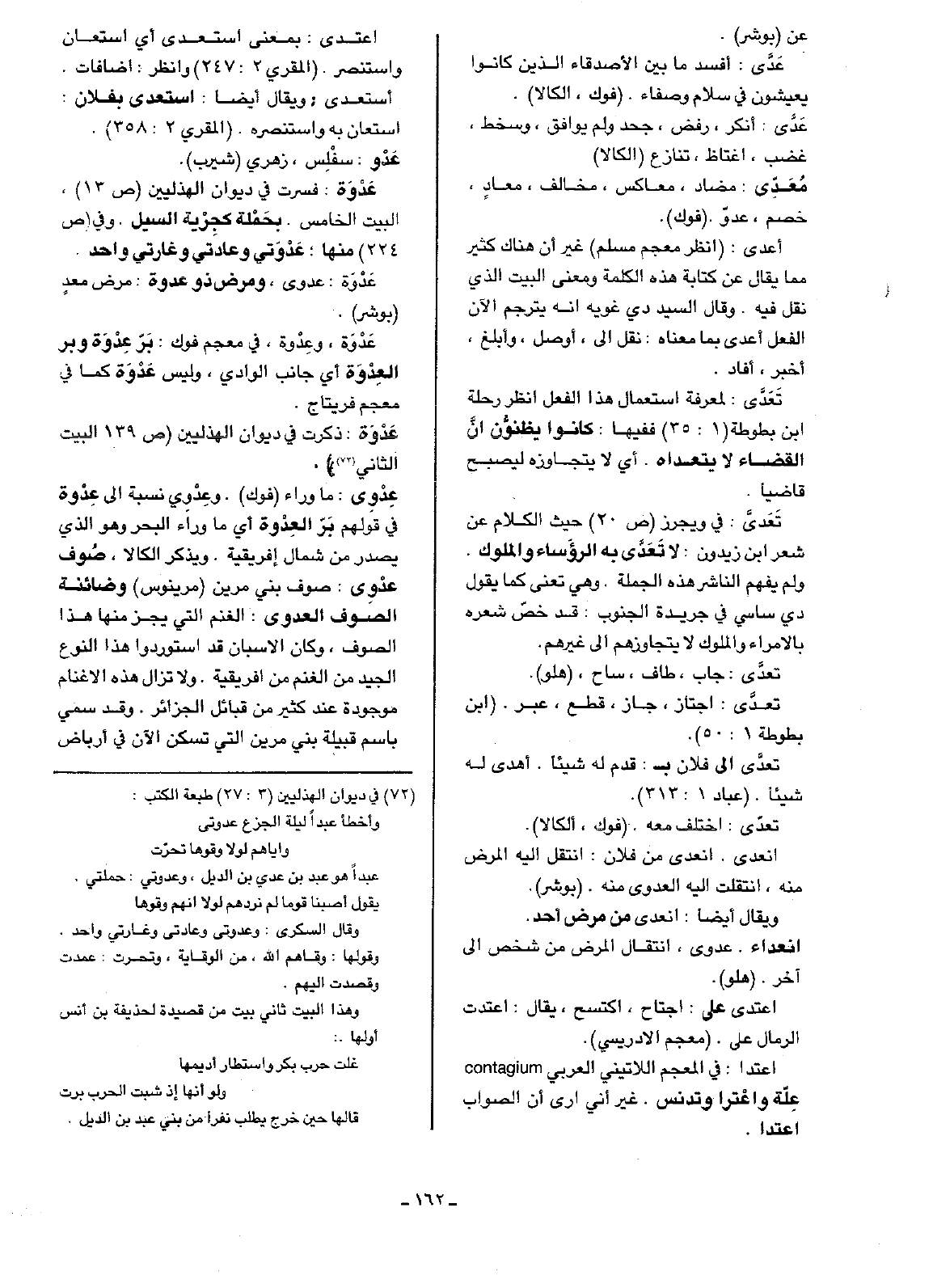 أعدى: (انظر معجم مسلم) غير أن هناك كثير مما يقال عن كتابة هذه الكلمة ومعنى البيت الذي نقل فيه. وقال السيد دي غويه إنه يترجم الآن الفعل أعدى بما معناه: نقل إلى، أوصل، وابلغ، أخبر، أفاد.