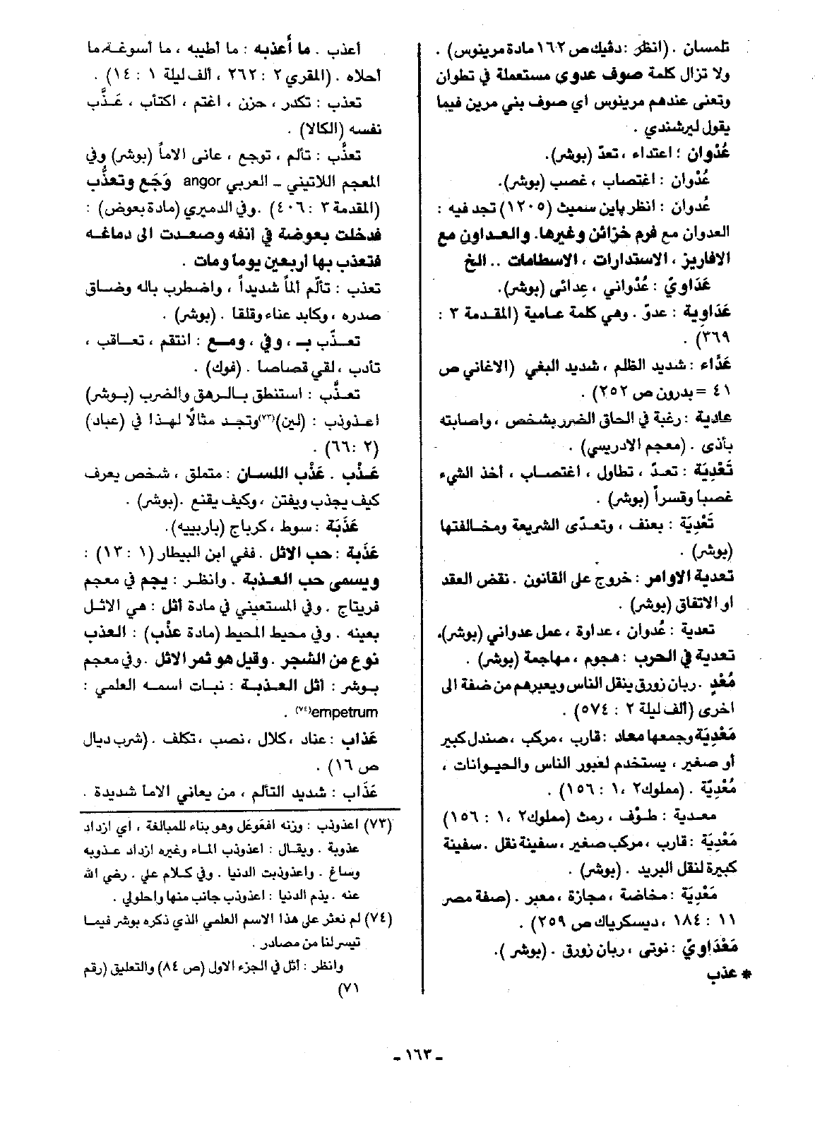 نعذَّب: تألم، توجع، عانى آلاماً (بوشر) وفي المعجم اللاتيني- العربي angor وَجَع وتعذُّب (المقدمة 3: 406). وفي الدميري (مادة بعوض): فدخلت بعوضة في أنفه وصعدت إلى دماغه فتعذب بها أربعين يوماً ومات.