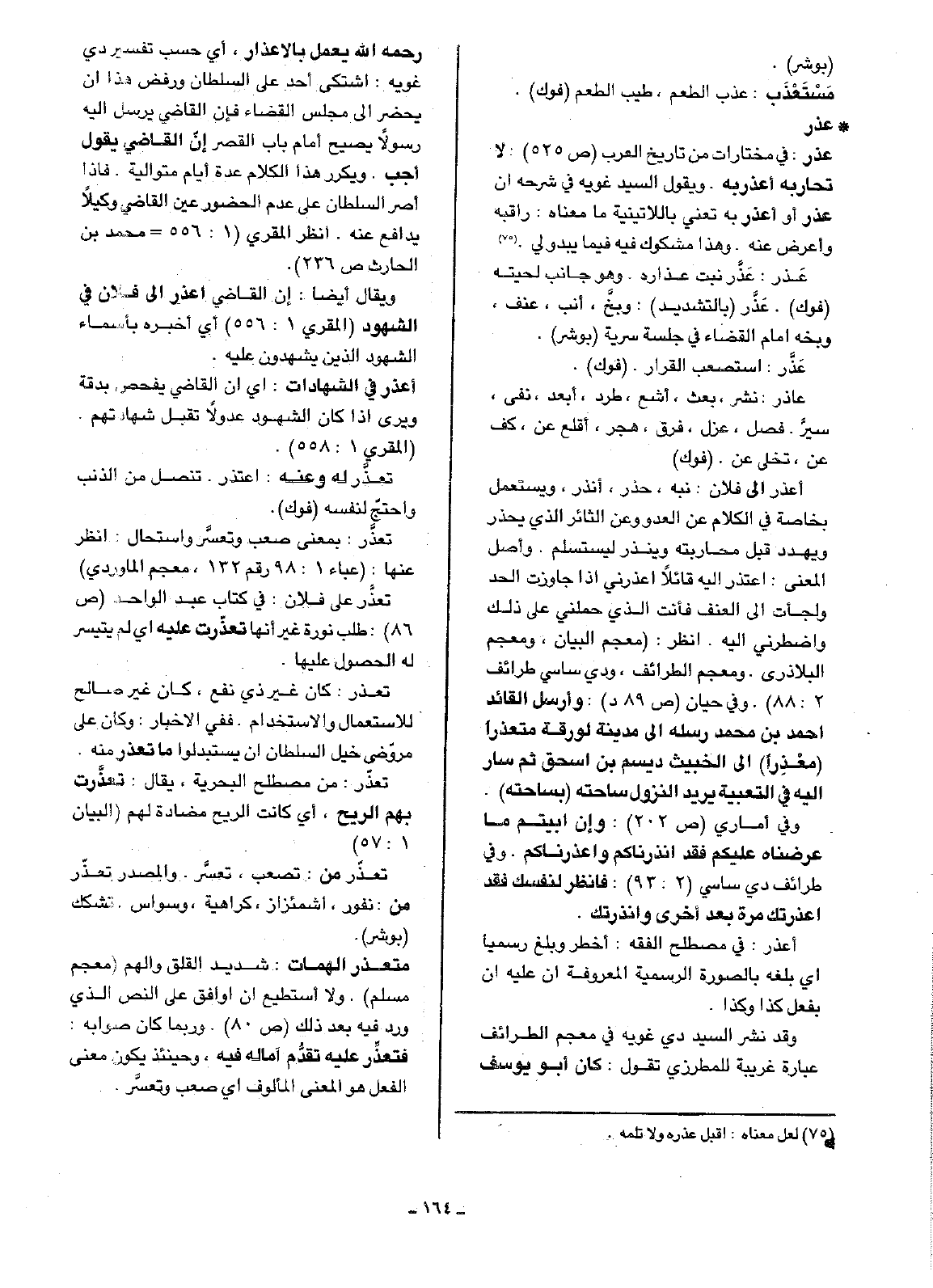 • عذر: عذر: في مختارات من تاريخ العرب (ص525): لا تحاربه أعذر به. ويقول السيد غويه في شرحه أن عذر أو أعذر به تعني باللاتينية ما معناه: راقبه وأعرض عنه. وهذا مشكوك فيه فيما يبدو لي.