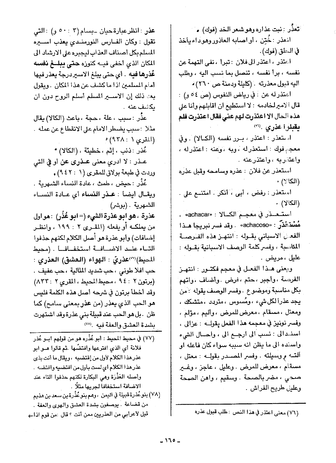 عذر: انظر عبارة حيان - بسام (3: 50و): التي تقول: وكان الفارس النورمندي يعذب أسيره المسلم بكل أصناف العذاب ليجبره على الإرشاد إلى المكان الذي أخفى فيه كنوزه حتى يبلغ نفسه عُذرها فيه. أي حتى يبلغ الأسير درجة يعذر فيها أمام المسلمين إذا ما كشف عن هذا المكان. ويقول بعد ذلك أن الأسير المسلم أسلم الروح دون أن يكشف عنه.