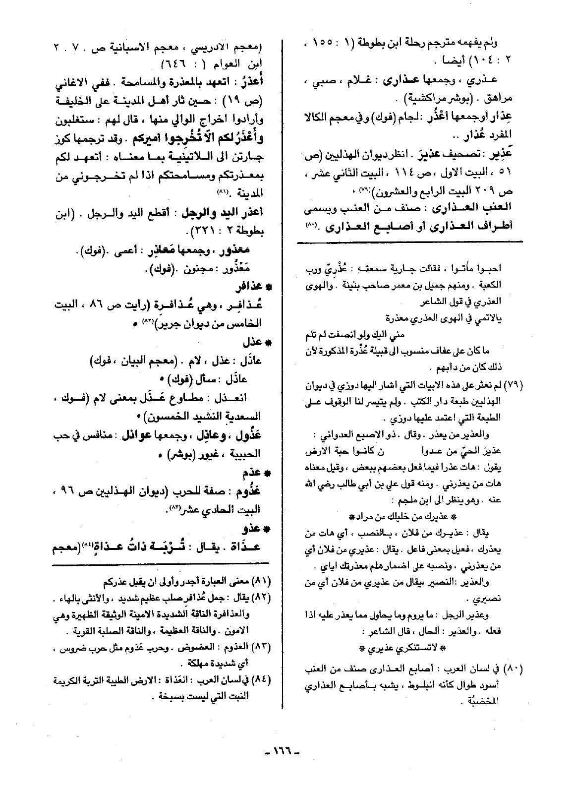 (معجم الادريسي، معجم الأسبانية ص2، 7 ابن العوام (: 646) أعذرُ: أتعهد بالمعذرة والمسامحة: ففي الأغاني (ص19): حين ثار أهل المدينة على الخليفة وأرادوا إخراج الوالي منها، قال لهم: ستغلبون وأعْذَرُ لكم ألا تُخْرجوا أميركم. وقد ترجمها كوز جارتن إلى اللاتينية بما معناه: أتعهد لكم بمعذرتكم ومسامحتكم إذا لم تخرجوني من المدينة.