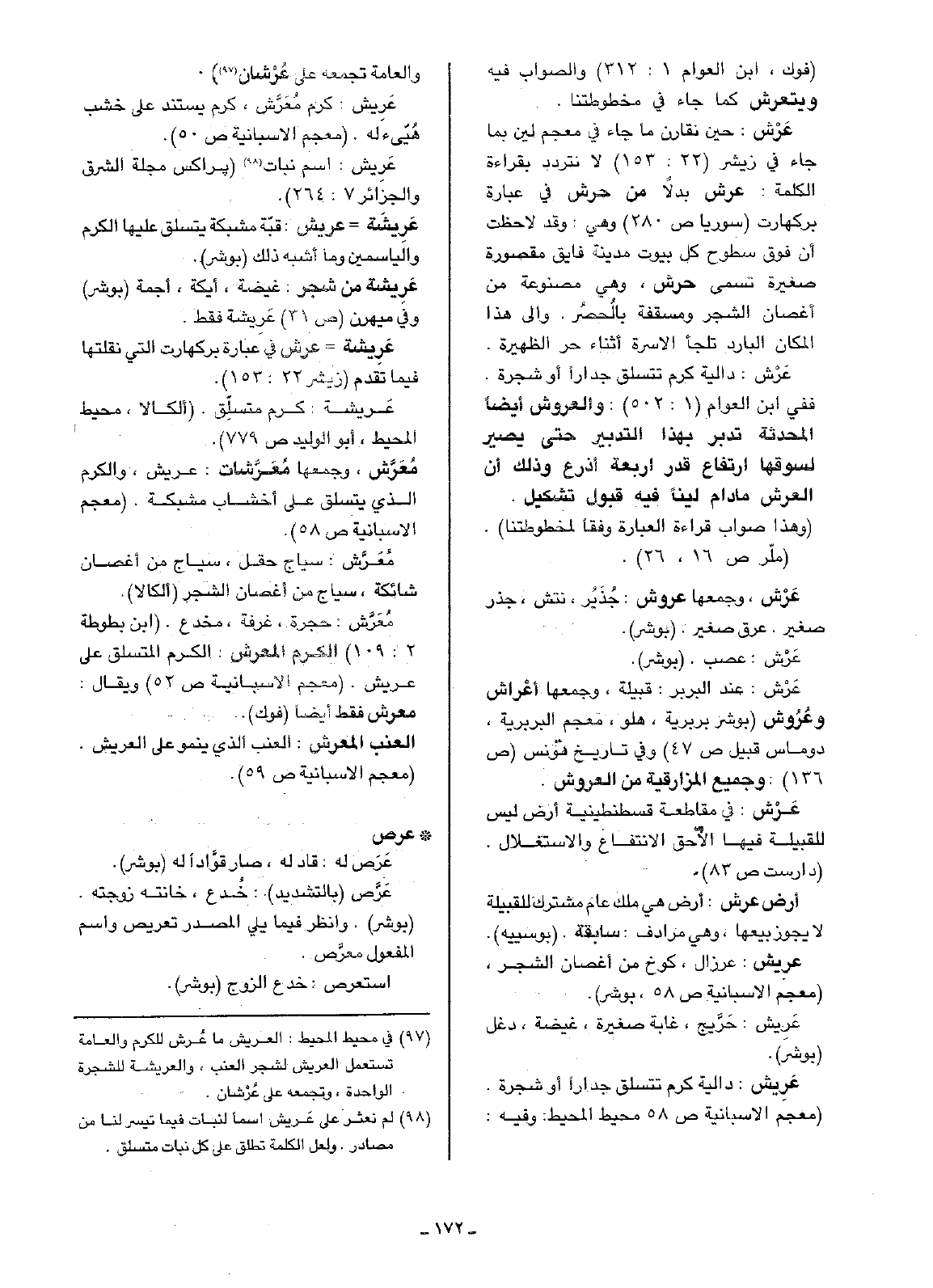 ففي ابن العوام (1: 502): والعروش أيضاً المحدثة تدبر بهذا التدبير حتى يصير لسوقها ارتفاع قدر أربعة أذرع وذلك أن العرش ما دام ليناً فيه قبول تشكيل. (وهذا صواب قراءة العبارة وفقاً لمخطوطتنا).
