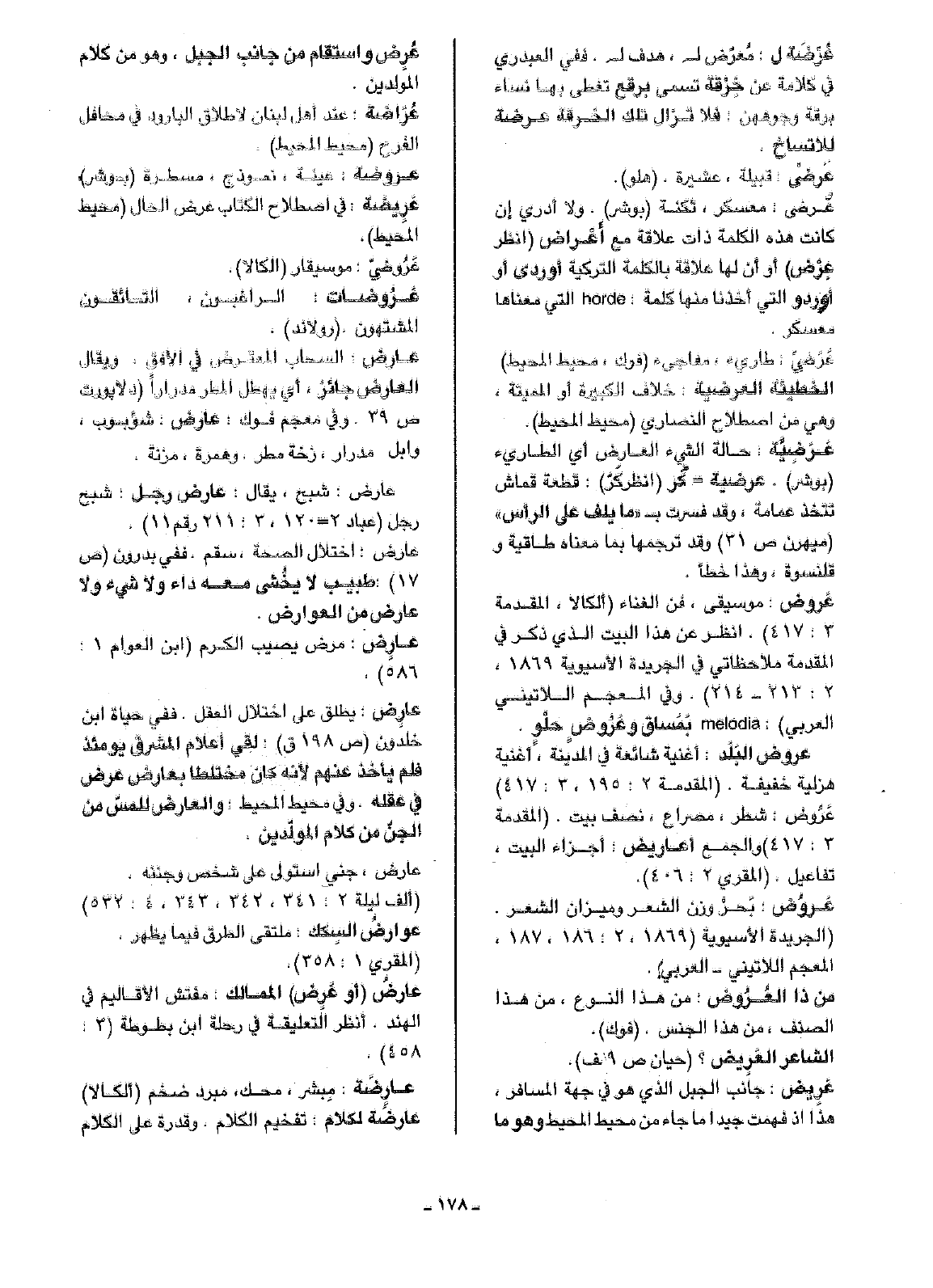عَروض: موسيقى، فن الغناء (ألكالا، المقدمة 3: 417). انظر عن هذا البيت الذي ذكر في المقدمة ملاحظاتي في الجريدة الآسيوية 1869، 2: 213 - 214). وفي المعجم اللاتيني العربي): melodia بَمَساق وعَرُوض حلْو.
