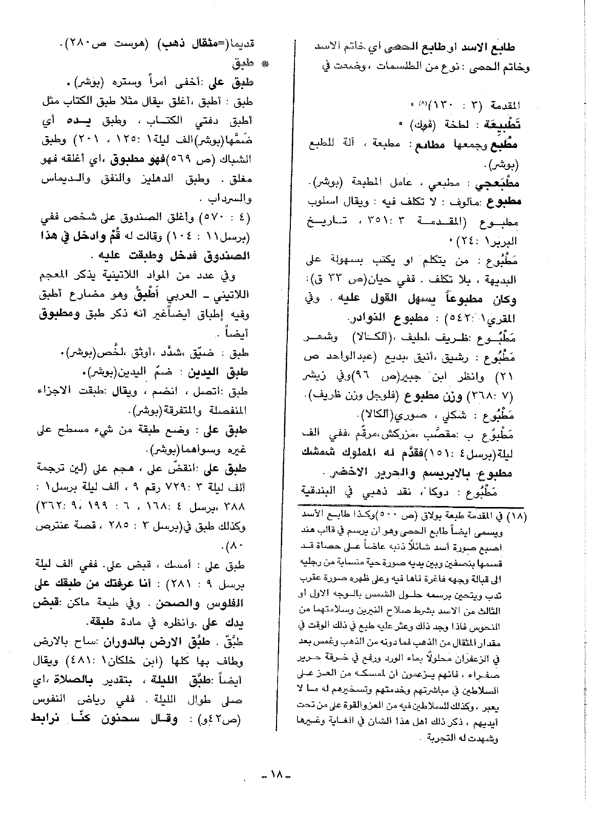 مَطْبُوع ب: مقصَّب، مزركش، مرقم، ففي ألف ليلة (برسل 4: 151) فقدَّم له المملوك شمشك مطبوع. بالابريسم والحرير الأخضر مَطْبُوع: دوكا، نقد ذهبي في البندقية قديما (= مثقال ذهب) (هوست ص280) • طبق: طبق على: أخفى أمراً وستره (بوشر).