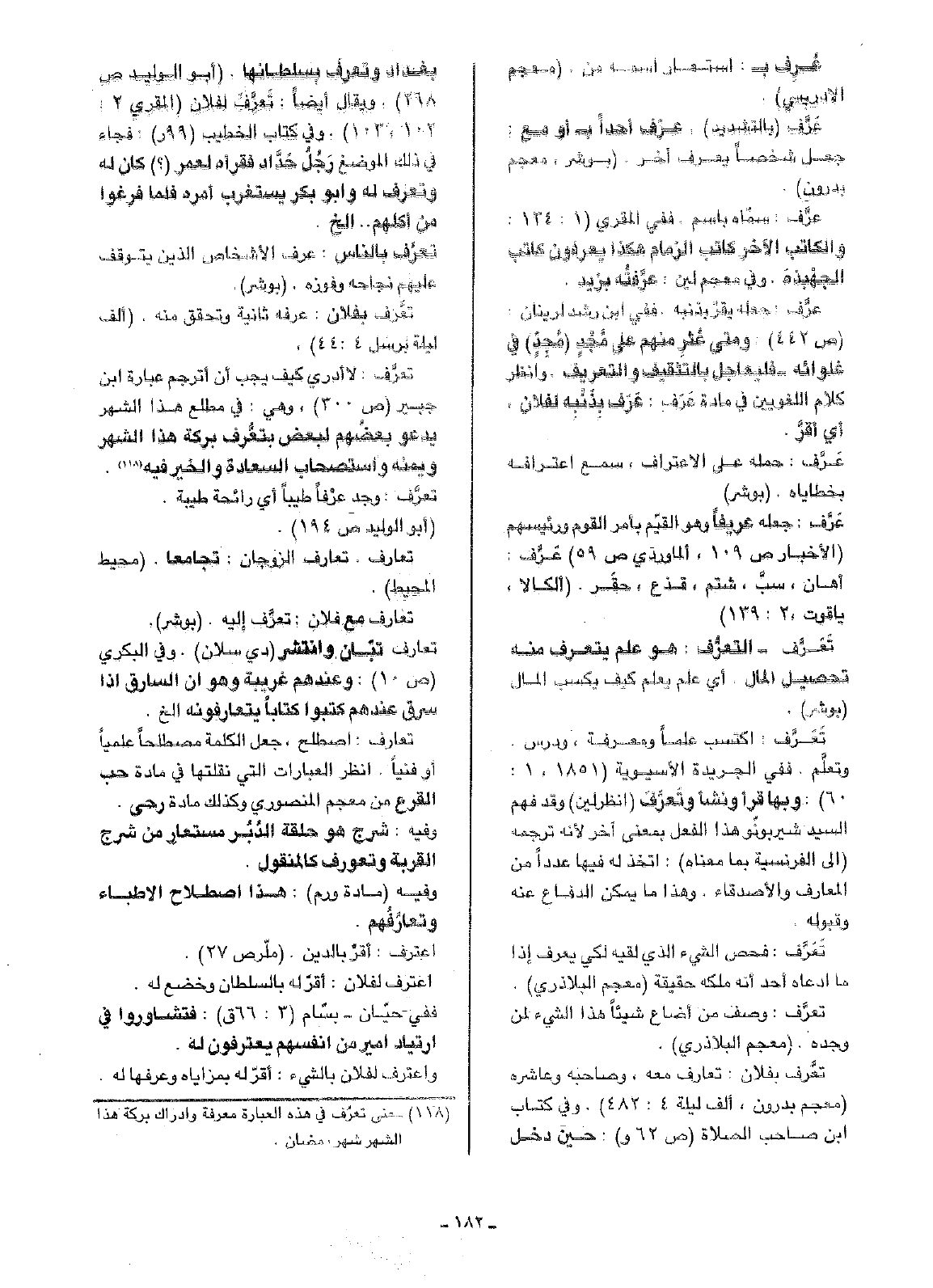 وتعلَّم. ففي الجريدة الآسيوية (1851، 1: 60): وبها قرأ ونشأ وتَعرَّفَ (انظر لين) وقد فهم السيد شير بونوّ هذا الفعل بمعنى آخر لأنه ترجمه (إلى الفرنسية بما معناه): اتخذ له فيها عدداً من المعارف والأصدقاء. وهذا ما يمكن الدفاع عنه وقبوله.