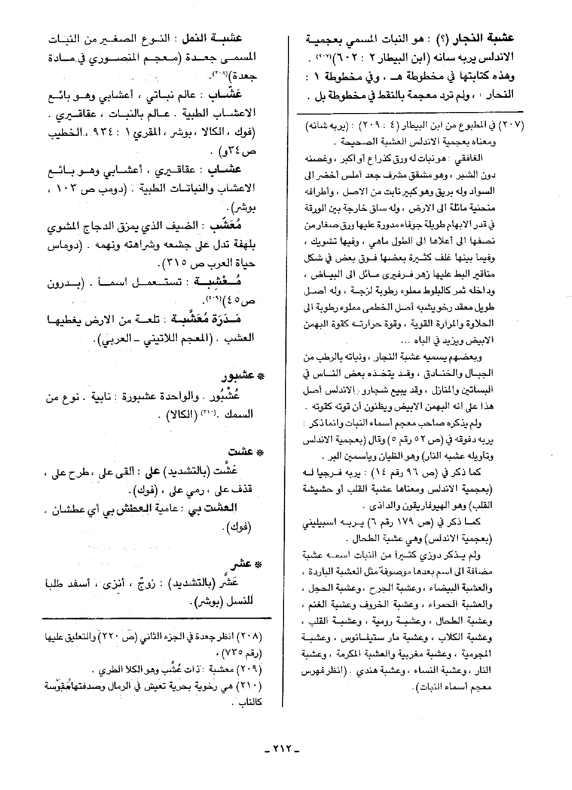 عشبة النجار (؟): هو النبات المسمي بعجمية الأندلس يربه سانه (ابن البيطار 2: 602). وهذه كتابتها في مخطوطة هـ، وفي مخطوطة 1: النحار، ولم ترد معجمة بالنقط في مخطوطة بل.