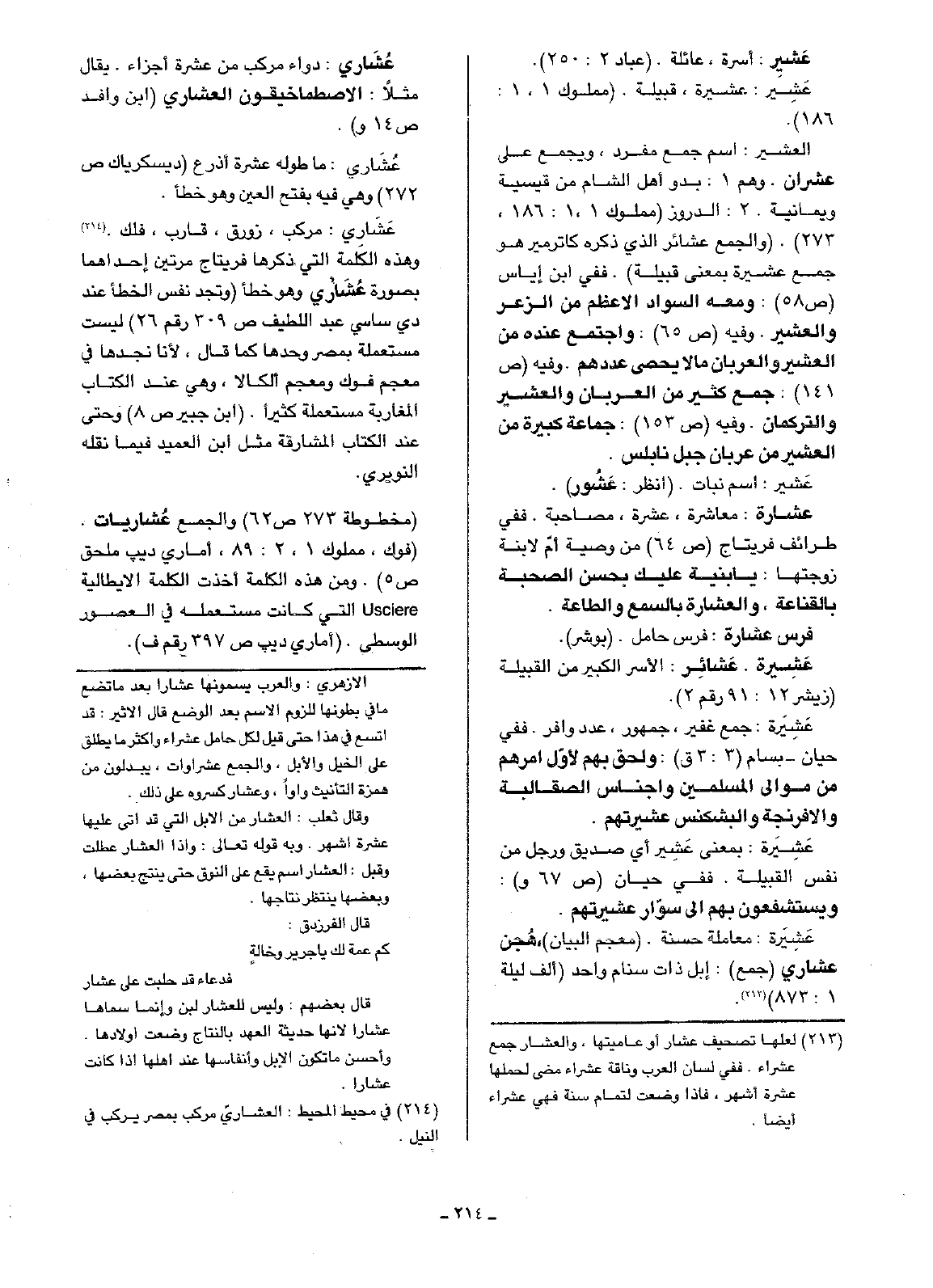 عَشَارِي: مركب، زورق، قارب، فلك. وهذه الكلمة التي ذكرها فريتاج مرتين إحدهما بصورة عُشَاري وهو خطأ (وتجد نفس الخطأ عند دي ساسي عبد اللطيف ص309) رقم 26 ليست مستعملة بمصر وحدها كما قال، لأنا نجدها في معجم فوك ومعجم الكالا، وهي عند الكتاب المغاربة مستعملة كثيراً. (ابن جبير ص8) وحتى عند الكتاب المشارقة مثل ابن العميد فيما نقله النويري.