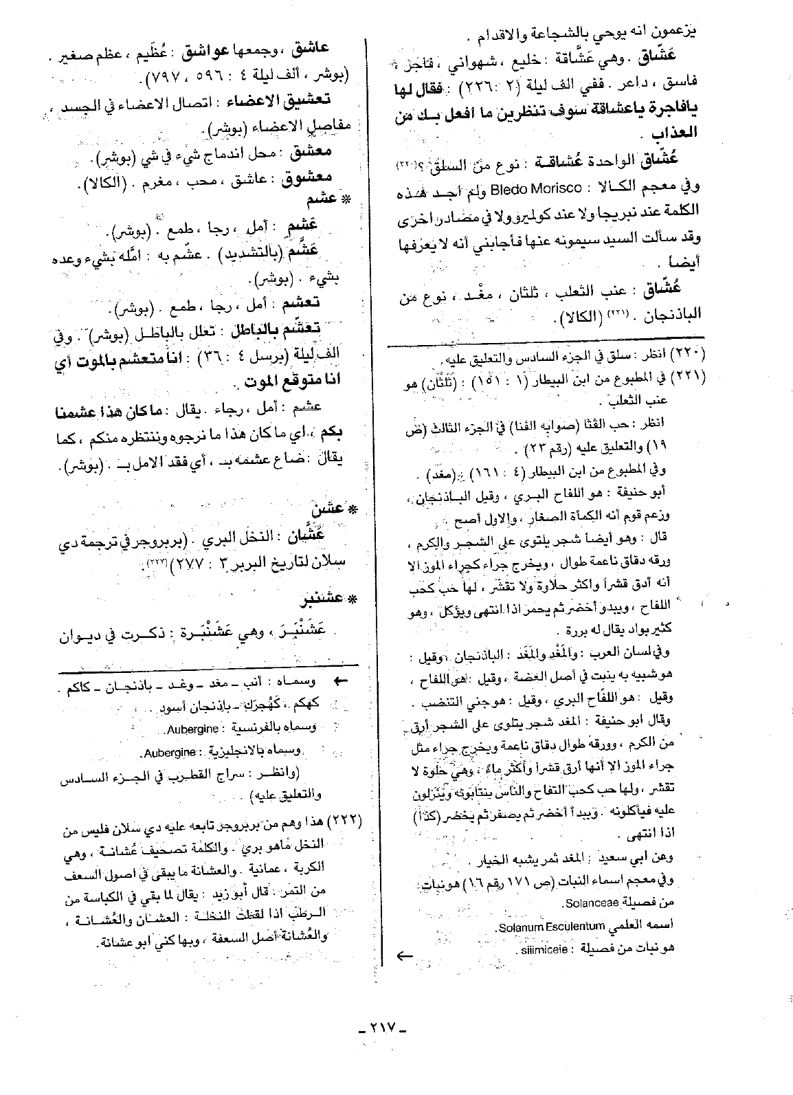 عُشّاق الواحدة عُشاقة: نوع من السلق؟ وفي معجم الكالا: Bledo Morisco ولم أجد هذه الكلمة عند نبريجا ولا عند كولميرو ولا في مصادر أخرى وقد سألت السيد سيمونه عنها فأجابني إنه لا يعرفها أيضاً.