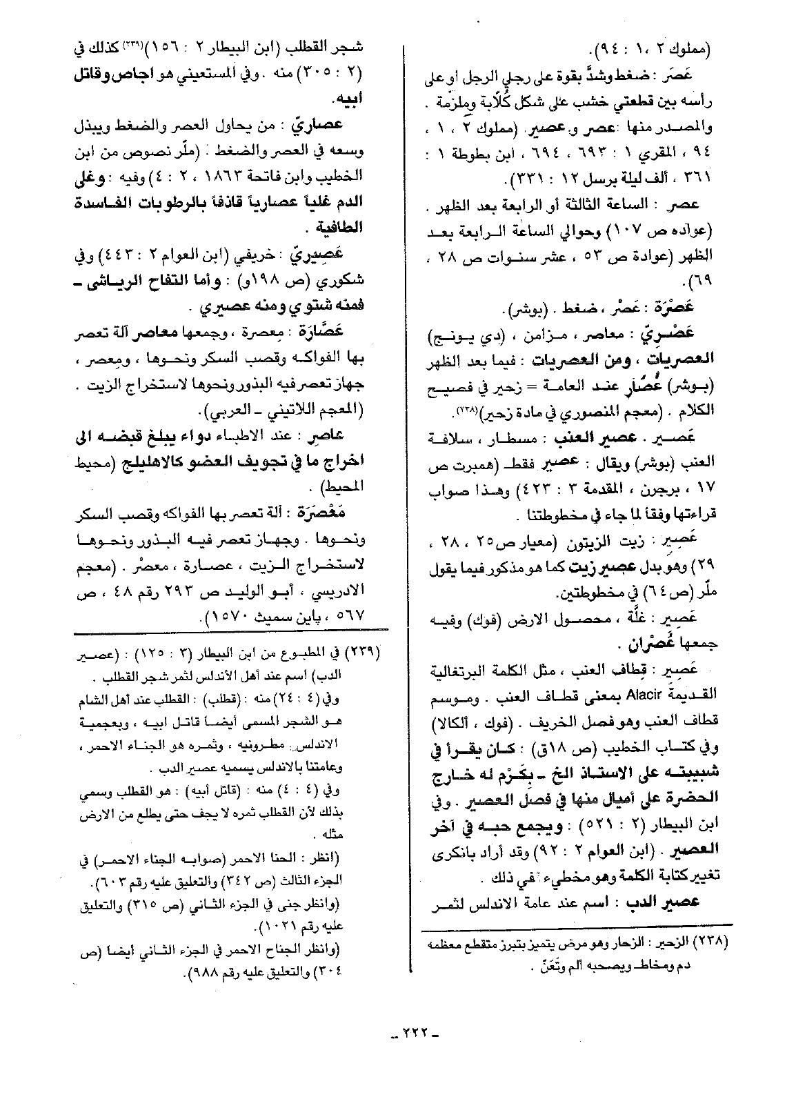عَصير. عصير العنب: مسطار، سلافة العنب (بوشر) ويقال: عصير فقط (همبرت ص17، برجون، المقدمة 3: 423) وهذا صواب قراءتها وفقاً لما جاء في مخطوطتنا.