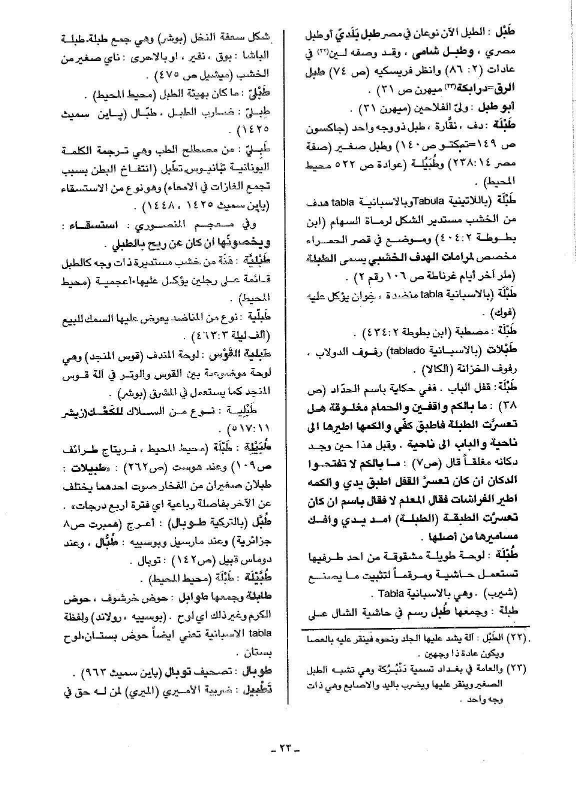 طَبْل: الطبل الآن نوعان في مصر طبل بلدي أو طبل مصري، وطبل شامي، وقد وصفه لين في عادات (2: 86) وانظر فريسكيه (ص74) طبل الرق= درابكة ميهرن ص31.