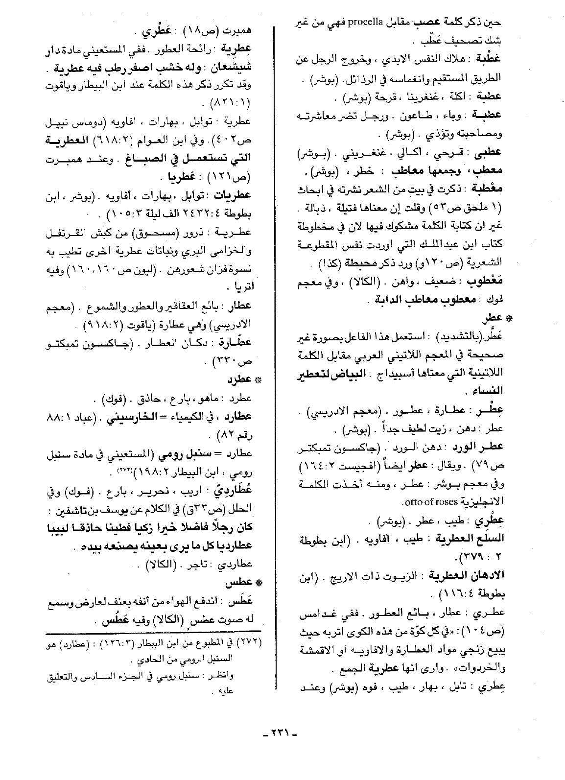 • عطر: عَطَّر (بالتشديد): استعمل هذا الفاعل بصورة غير صحيحة في المعجم اللاتيني العربي مقابل الكلمة اللاتينية التي معناها أسبيداج: البياض لتعطير النساء.