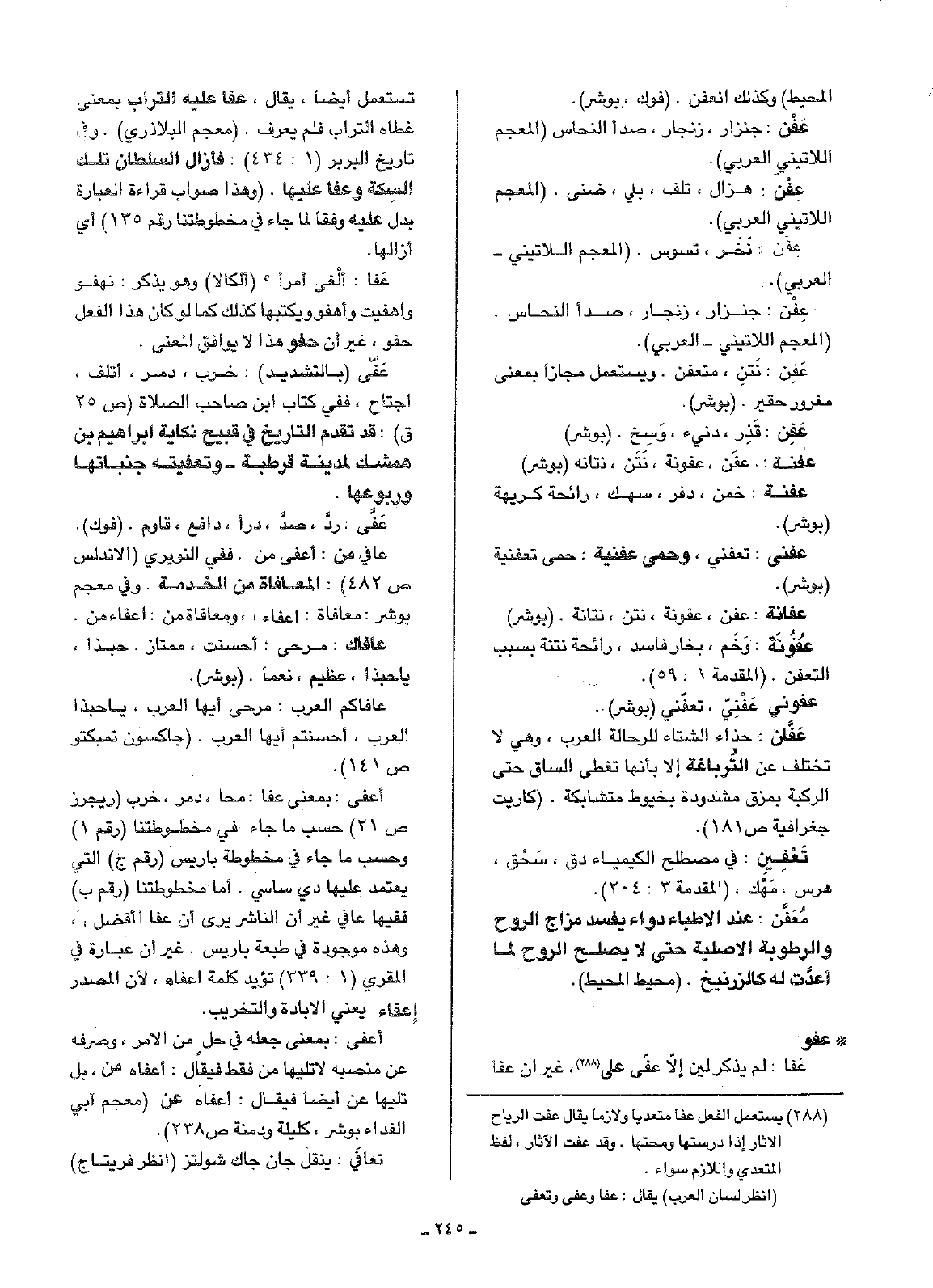 • عفو: عَفا: لم يذكر لين إلاّ عفّى على، غير أن عفا تستعمل أيضاً، يقال، عفا عليه التراب بمعنى غطاه التراب فلم يعرف. (معجم البلاذري). وفي تاريخ البربر (1: 434): فأزال السلطان تلك السِكة وعفا عليها. (وهذا صواب قراءة العبارة بدل عليه وفقاً لما جاء في مخطوطتنا رقم 135) أي أزالها.
