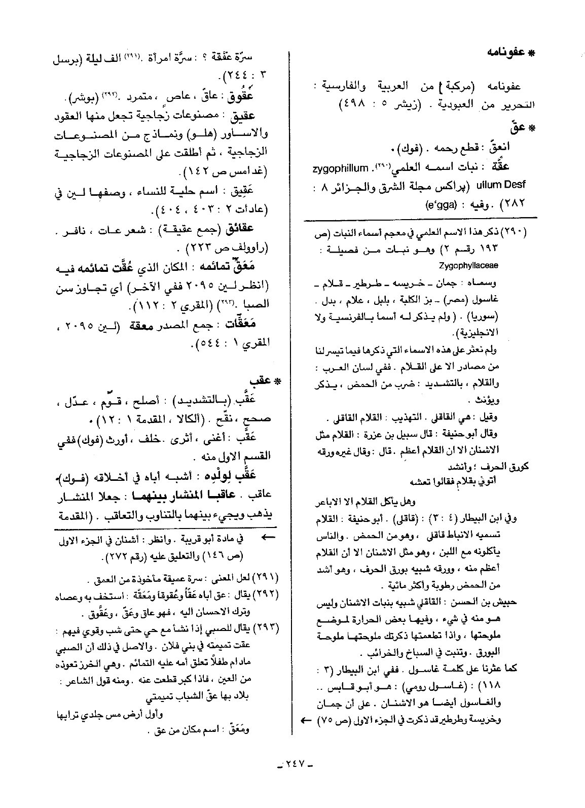 عقّة: نبات اسمه العلمي zygophillum ullum Desf ( براكس مجلة الشرق والجزائر 8: 282). وفيه: ( e?gga) .