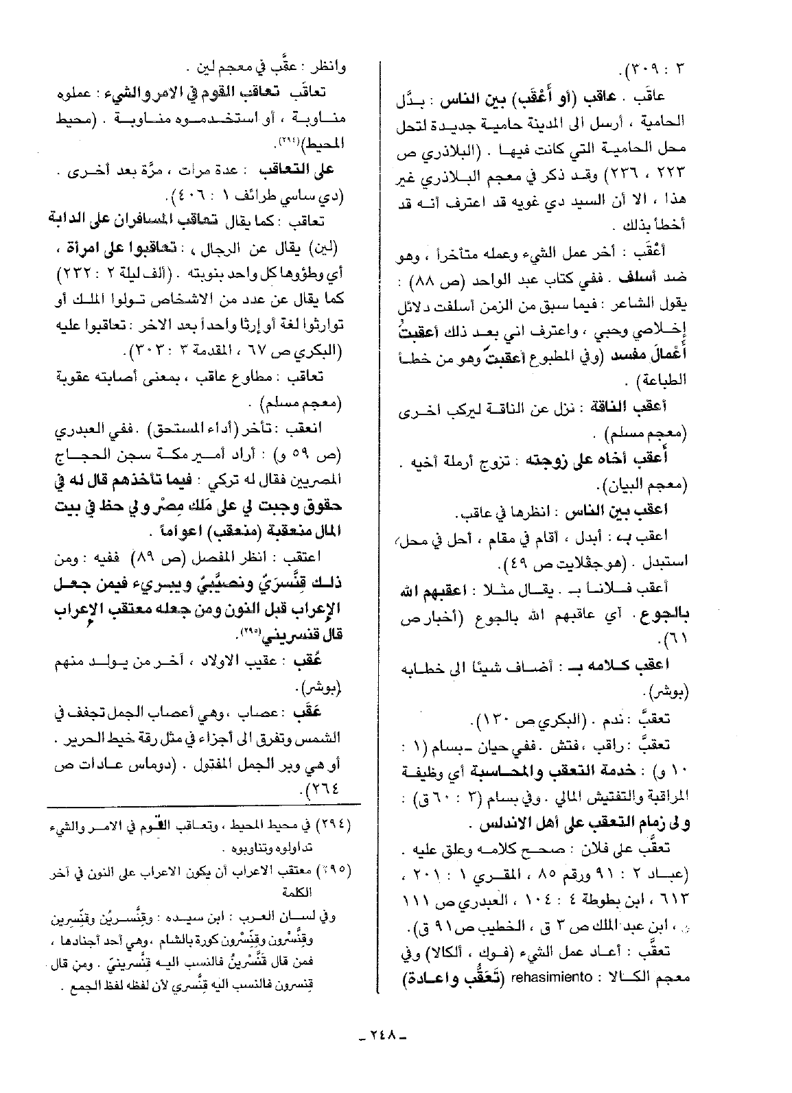 عاقب. عاقب (أو أعْقَب) بين الناس: بدَّل الحامية، أرسل إلى المدينة حامية جديدة لتحل محل الحامية التي كانت فيها. (البلاذري ص223، 236) وقد ذكر في معجم البلاذري غير هذا، إلا أن السيد دي غويه قد اعترف إنه قد أخطأ بذلك.