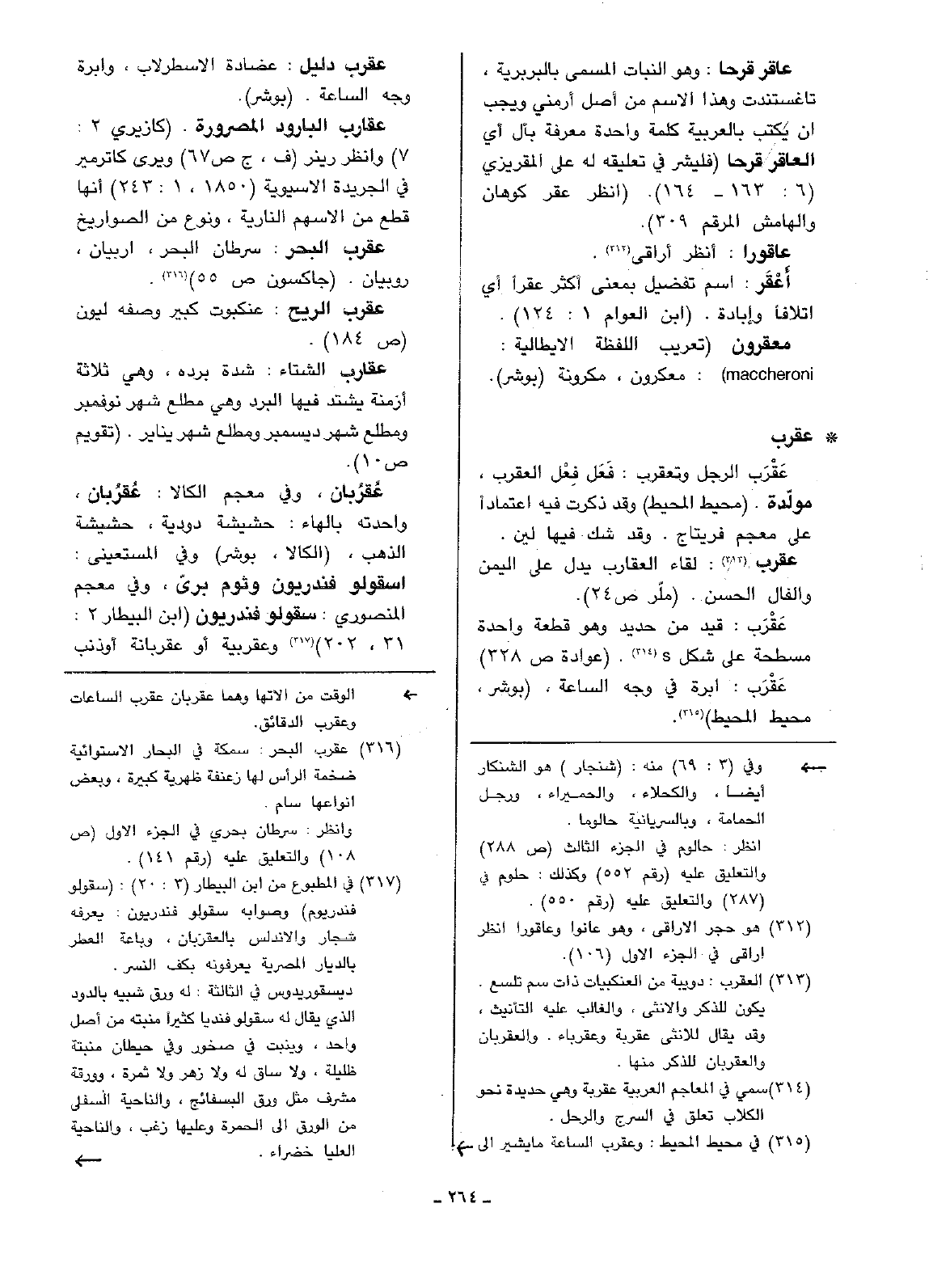 • عقرب: عَقْرَب الرجل وتعقرب: فَعَل فِعْل العقرب، مولّدة. (محيط المحيط) وقد ذكرت فيه اعتمادا على معجم فريتاج. وقد شك فيها لين.