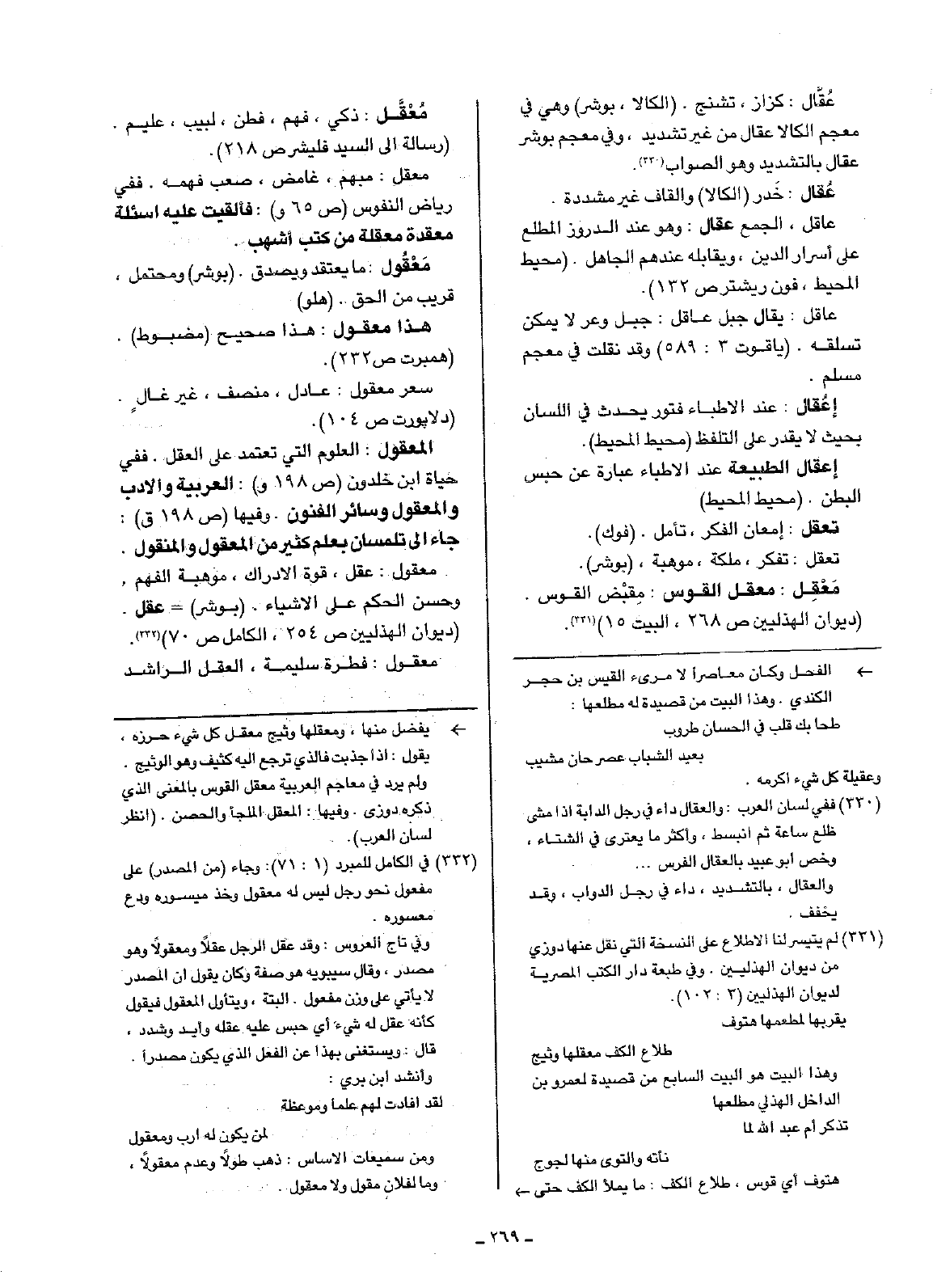 معقول: عقل، قوة الإدراك، موهبة الفهم، وحسن الحكم على الأشياء. (بوشر) = عقل. (ديوان الهذليين ص254، الكامل ص70).
