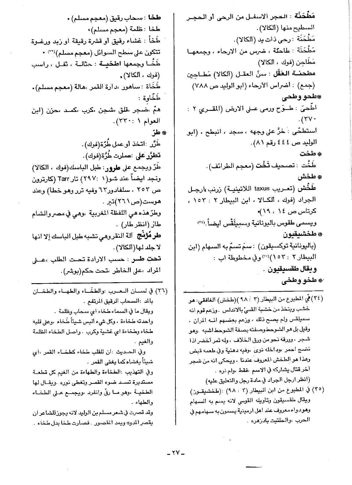 • طخش: طَخُش (تعريب taxus اللاتينية) زرنب، أرجل الجراد (فوك، ألكالا، ابن البيطار 2: 153، كرتاس ص14، 19) ويسمى طقوس باليونانية وسمِيلَقْس أيضاً