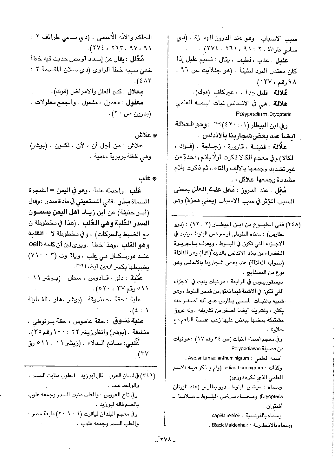 علالة: هي في الأندلس نبات اسمه العلمي Polypodium Dryopteris وفي ابن البيطار (1: 420): وهو العلالة أيضاً عند بعض شجاربنا بالأندلس.