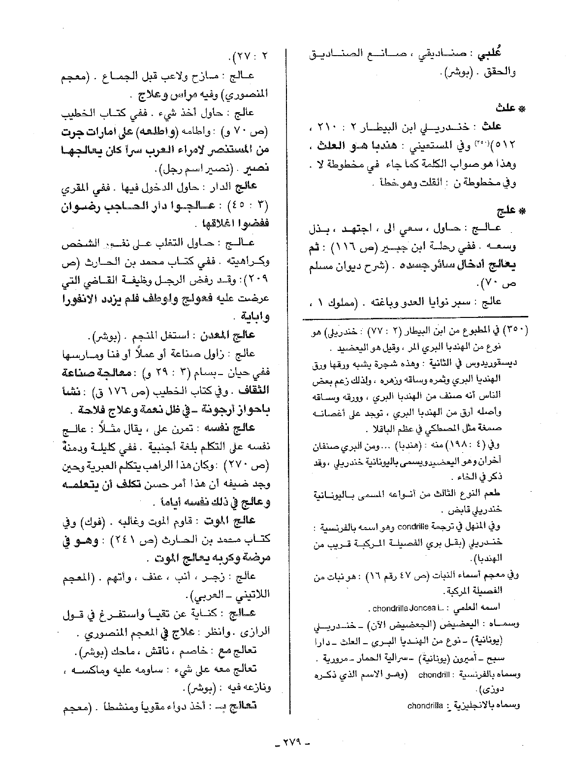 • علث: علث: خندريلي ابن البيطار 2: 210، 512) وفي المستعيني: هندبا هو العلث، وهذا هو صواب الكلمة كما جاء في مخطوطة لا.