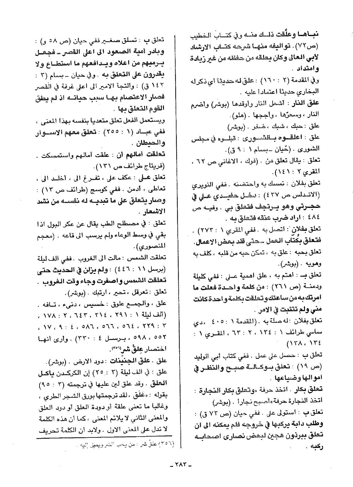 علق: في ألف ليلة (3: 25) أن الكركدن يأكل العلق. وقد علق لين عليها في ترجمته (3: 95) بقوله: (عَلَق)، لقد ترجمتها بورق الشجر الطري، وغالباً ما تعني علقة أو دودة العلق أو دود العلق والمعنى الثاني لا يلائم المعنى، كما أن هذه الكلمة لا تدل على المعنى الأول. ولا بد أن الكلمة تحريف