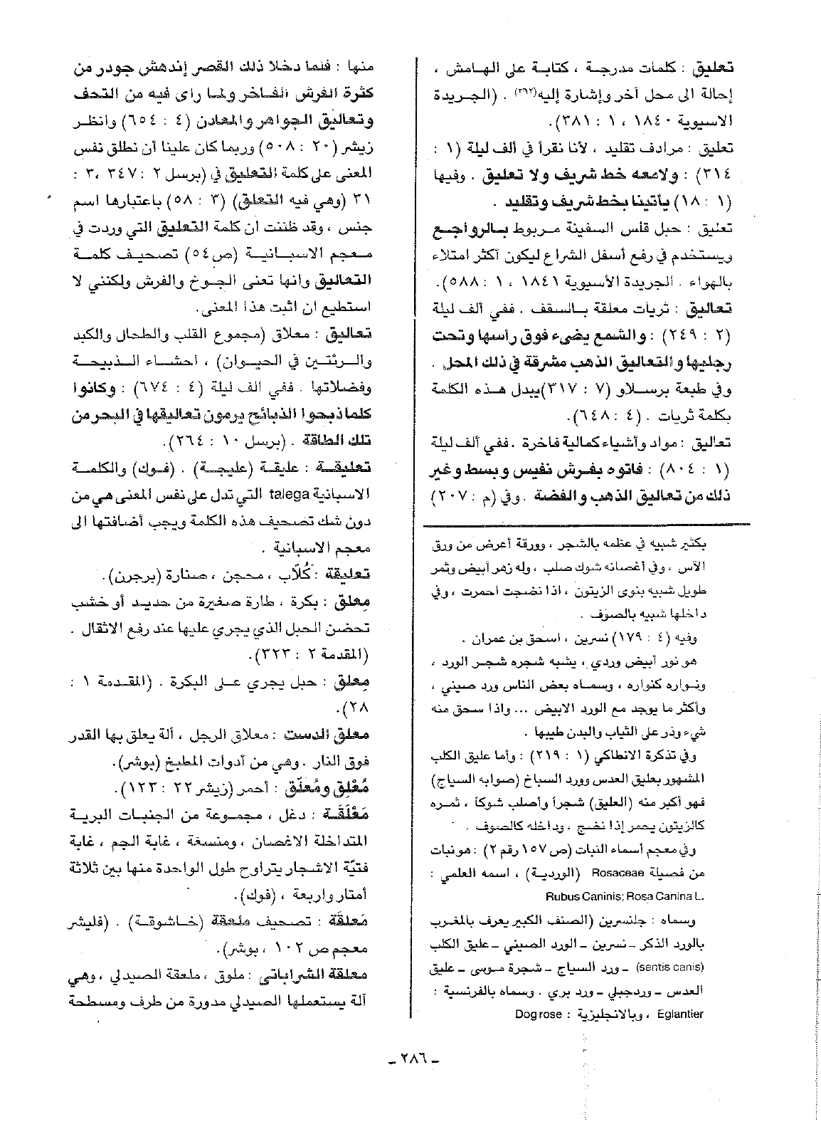 تعاليق: مواد وأشياء كمالية فاخرة. ففي ألف ليلة (1: 804): فاتوه بفرش نفيس وبسط وغير ذلك من تعاليق الذهب والفضة. وفي (م: 207) منها: فلما دخلا ذلك القصر اندهش جودر من كثرة الفرش الفاخر ولما رأى فيه من التحف وتعاليق الجواهر والمعادن (4: 654) وانظر زيشر (20: 508) وربما كان علينا أن نطلق نفس المعنى على كلمة التعليق في (برسل 2: 347، 3: 31 (وهي فيه التعليق) (3: 58) باعتبارها اسم جنس، وقد ظننت أن كلمة التعليق التي وردت في معجم الأسبانية (ص54) تصحيف كلمة التعاليق وإنها الجوخ والفرش ولكنني لا أستطيع أن اثبت هذا المعنى.