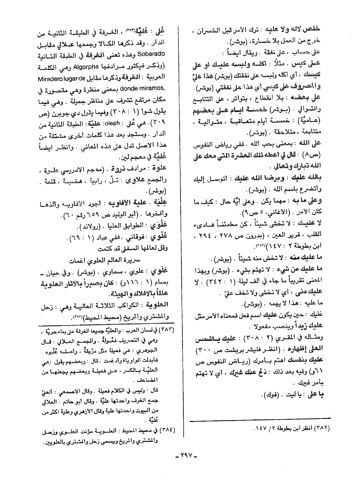 عُِلى: عُليَّة، الغرفة في الطبقة الثانية من الدار، وقد ذكرها الكالا وجمعها علالي مقابل Soberado وهذه تعني الغرفة في الطبقة الثانية (وذكر فيكتور مرادفها Algorpha وهي الكلمة العربية: الغرفة وذكرها مقابل Miradero lugar de donde miramos بمعنى منظرة وهي مقصورة في مكان مرتفع تشرف على مناظر جميلة. وهي فيما يقول شوا (1: 308) وفيما يقول دي جوبرن (ص309). هي عُلى: oleah: عليّة: الطبقة الثانية من الدار، وستجد بعد هذا كلمات أخرى مشتقة من هذا الأصل تدل على هذه المعاني. وانظر أيضاً عُليَّة في معجم لين.