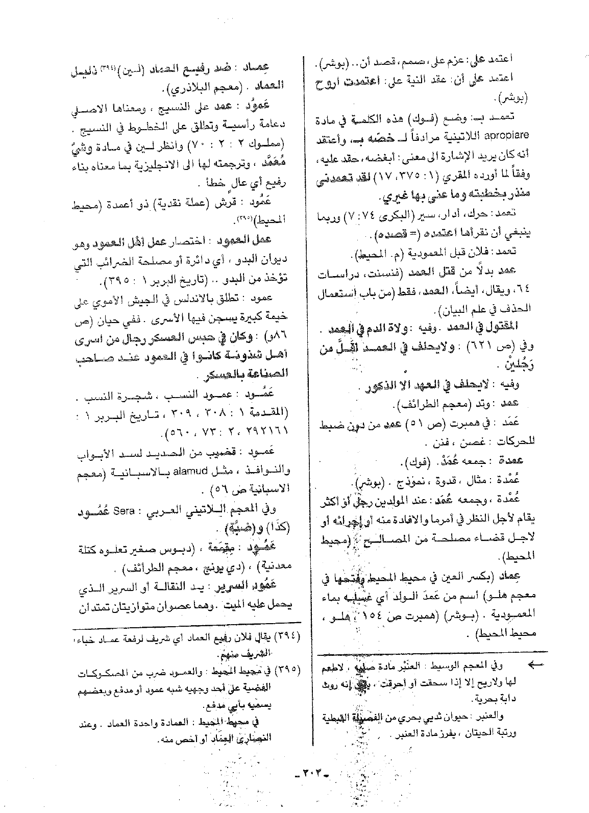 عَموُد: عمد على النسيج، ومعناها الأصلي دعامة رأسية وتطلق على الخطوط في النسيج. (مملوك 2: 2: 70) وانظر لين في مادة وشيٌ مُعَمَّد، وترجمته لها إلى الإنجليزية بما معناه بناء رفيع أي عالٍ خطأ.