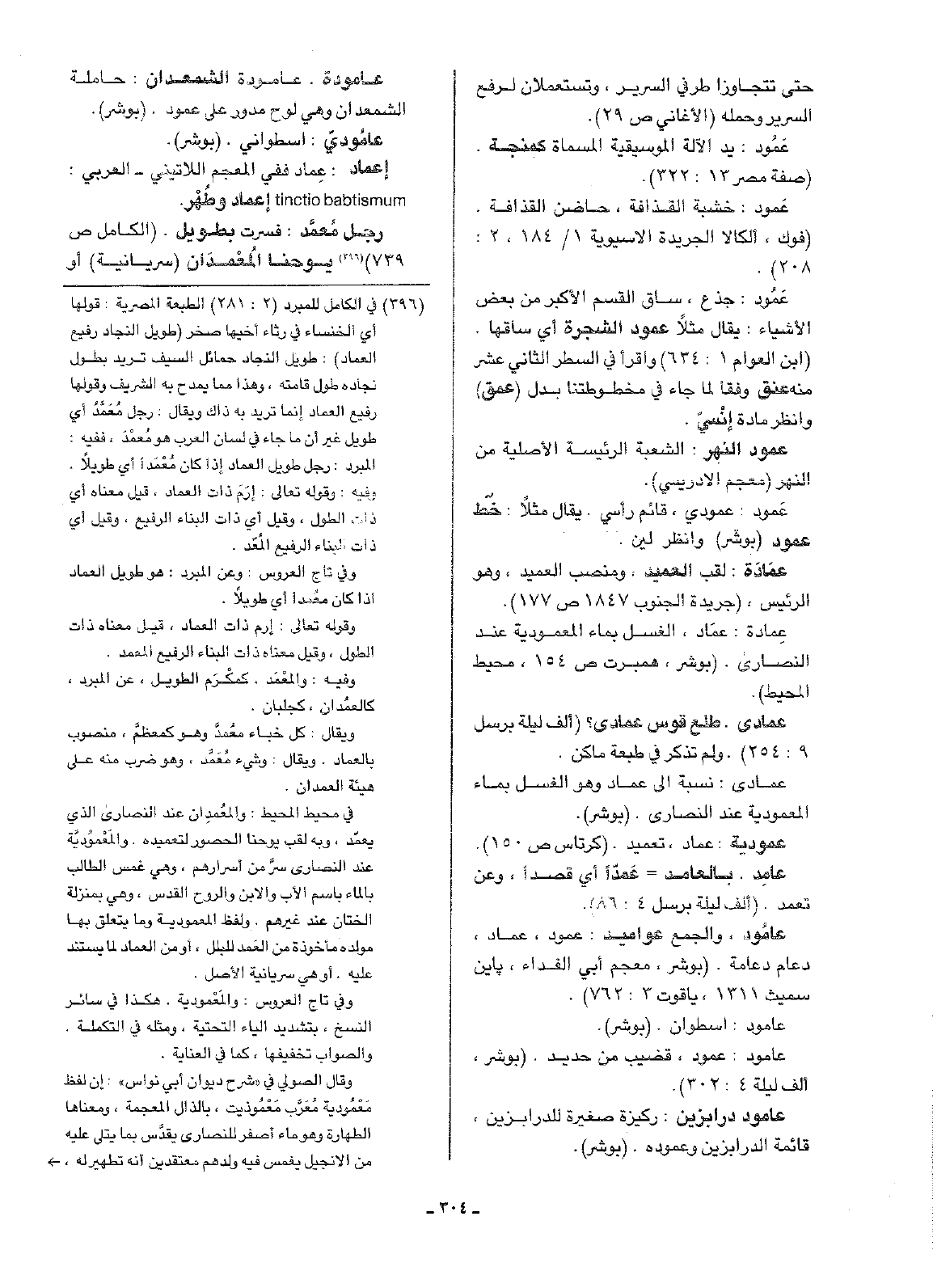 عامُود، والجمع عواميد: عمود، عماد، دعام دعامة. (بوشر، معجم أبي الفداء، باين سميث 1311، ياقوت 3: 762).