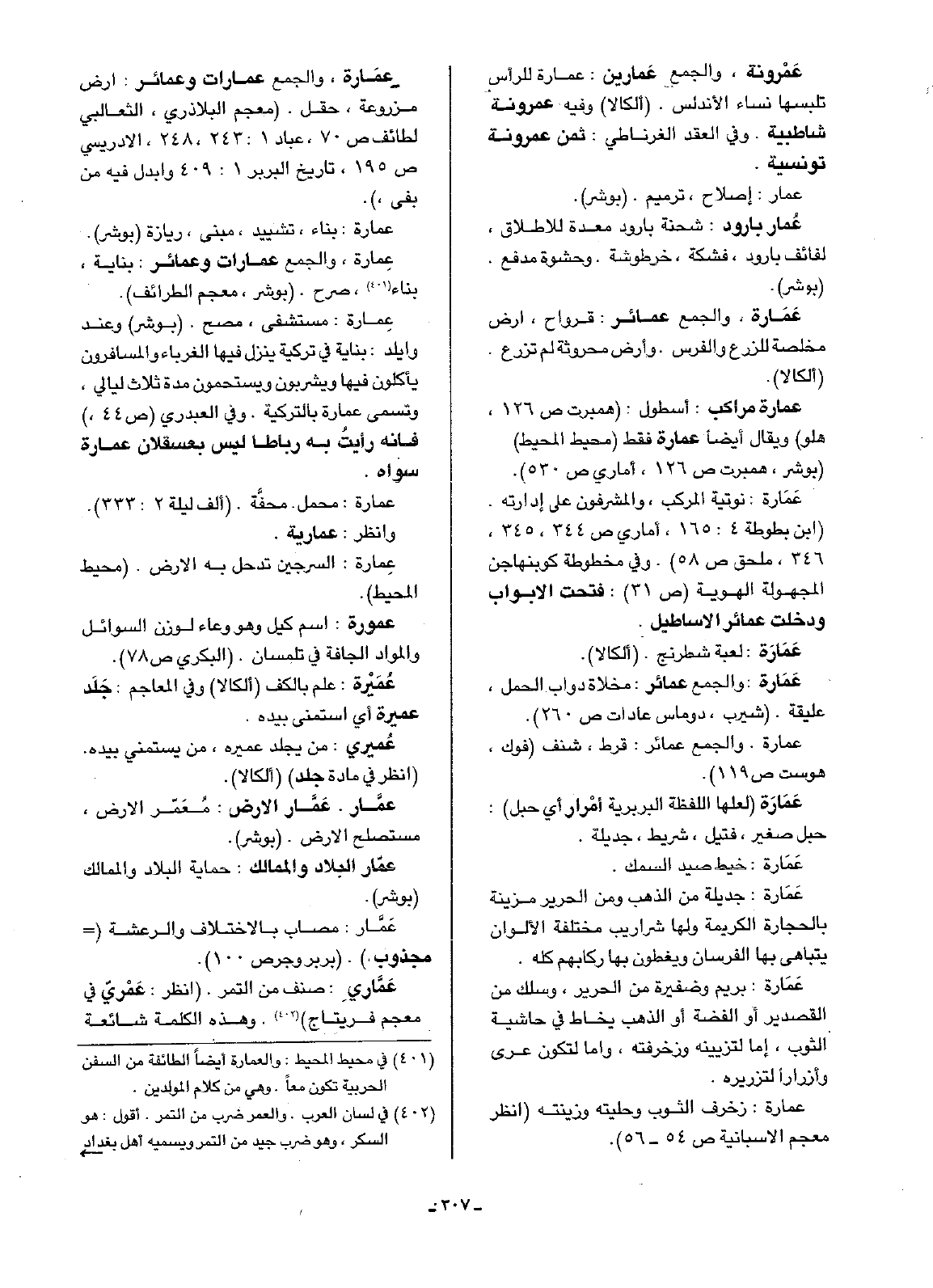 عِمَارة، والجمع عمارات وعمائر: أرض مزروعة، حقل. (معجم البلاذري، الثعالبي لطائف ص70، عباد 1: 243، 248، الادريسي ص195، تاريخ البربر 1: 409 وأبدل فيه من بفي).