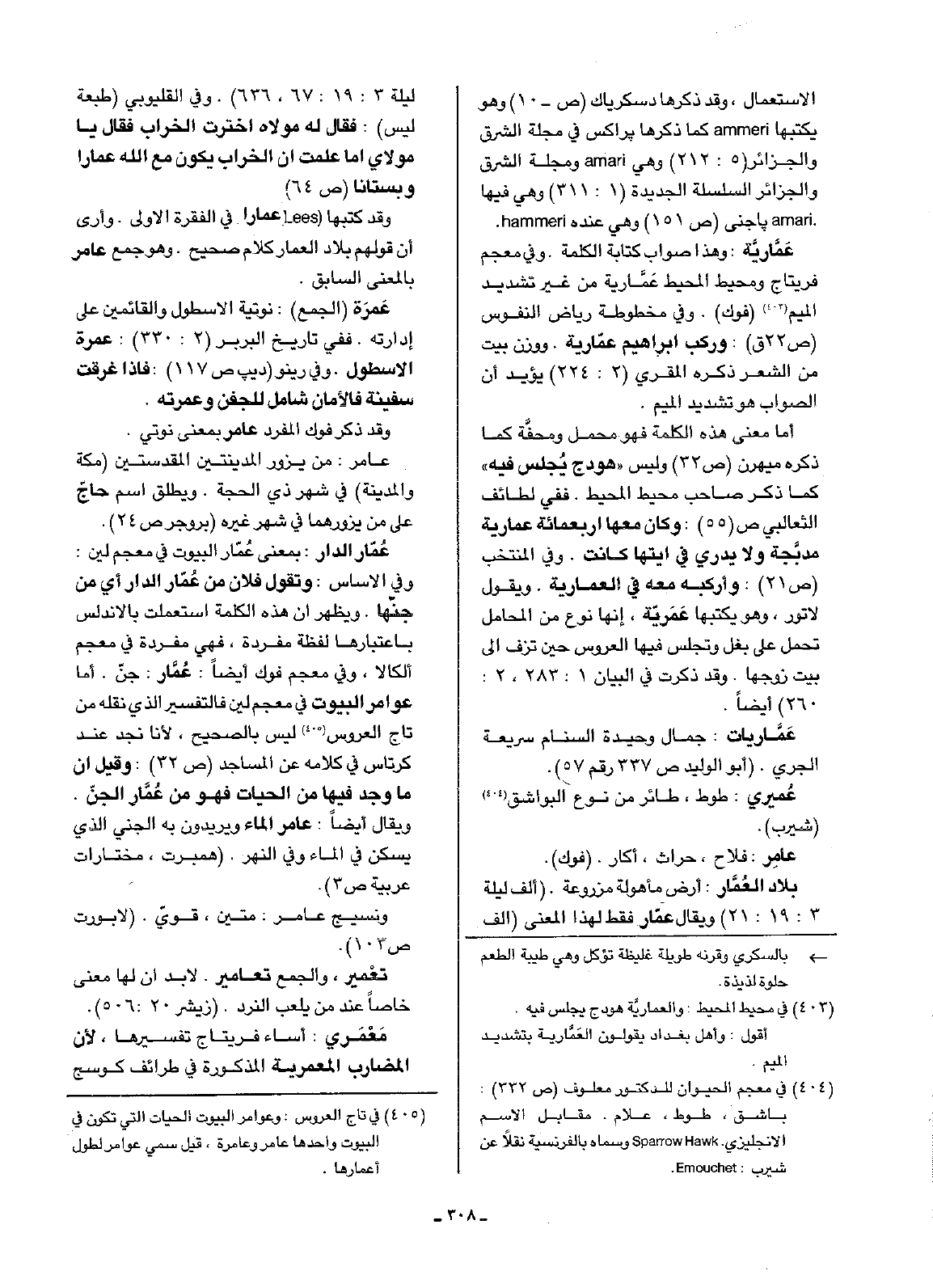 وقد كتبها ( Lees) عمارا في الفقرة الأولى. وأرى أن قولهم بلاد العمار كلام صحيح. وهو جمع عامر بالمعنى السابق.