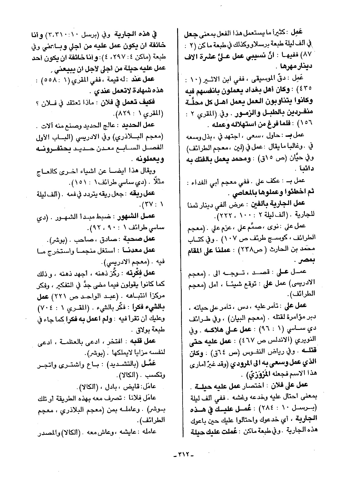عَمِل: كثيرا: ما يستعمل هذا الفعل بمعنى جعل في ألف ليلة طبعة برسلاو وكذلك في طبعة ماكن (2: 87) ففيها: أن نسيبي عمل علىَّ عشرة آلاف دينار مهرها.
