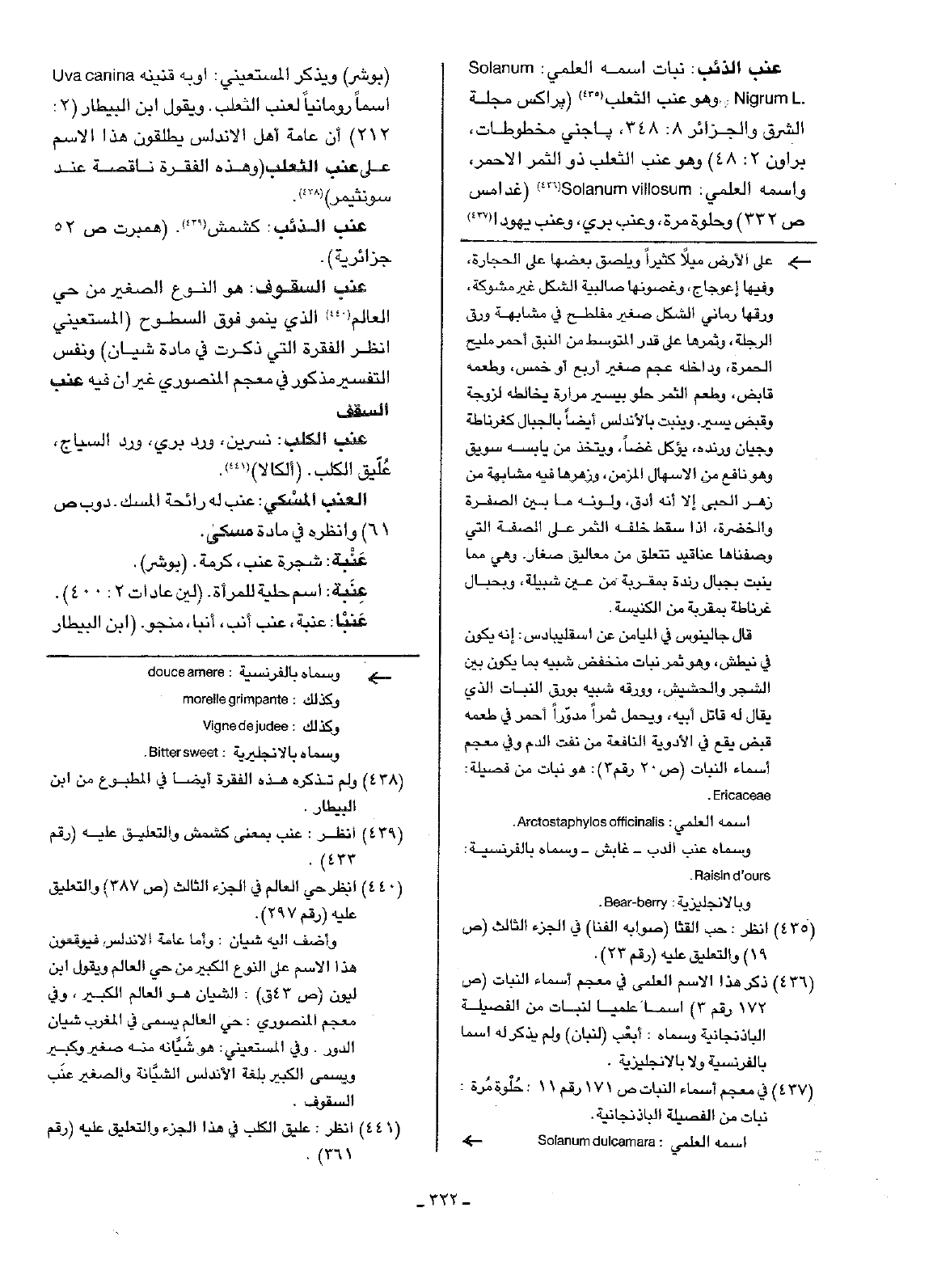 عنب الذئب: نبات اسمه العلمي: Solanum Nigrum L. . وهو عنب الثعلب (براكس مجلة الشرق والجزائر 8: 348، باجني مخطوطات، براون 2: 48) وهو عنب الثعلب ذو الثمر الاحمر، واسمه العلمي: Solanum villosum. ( غدامس ص332) وحلوة مرة، وعنب بري، وعنب يهودا (بوشر) ويذكر المستعيني: اوبه قنينه Uva canina اسماً رومانياً لعنب الثعلب. ويقول ابن البيطار (2: 212) أن عامة أهل الأندلس يطلقون هذا الاسم على عنب الثعلب (وهذه الفقرة ناقصة عند سونثيمر).