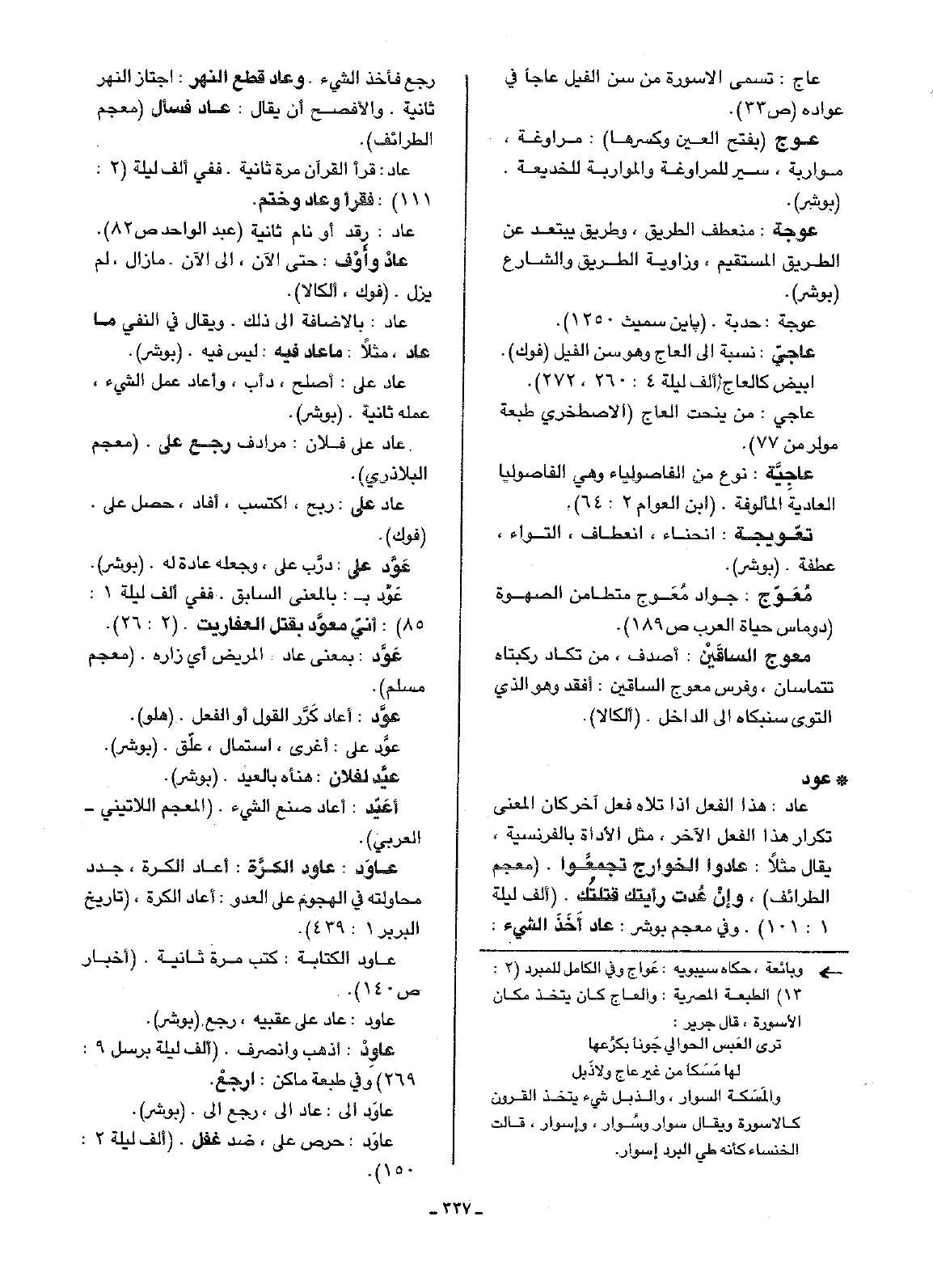 • عود: عاد: هذا الفعل إذا تلاه فعل آخر كان المعنى تكرار هذا الفعل الآخر، مثل الأداة بالفرنسية، يقال مثلاً: عادوا الخوارج تجمعَّوا. (معجم الطرائف). وإنْ عُدت رأيتك قتلتُك. (ألف ليلة 1: 101). وفي معجم بوشر: عاد أَخَذَ الشيء: رجع فأخذ الشيء. وعاد قطع النهر: اجتاز النهر ثانية. والأفصح أن يقال: عاد فسأل (معجم الطرائف).
