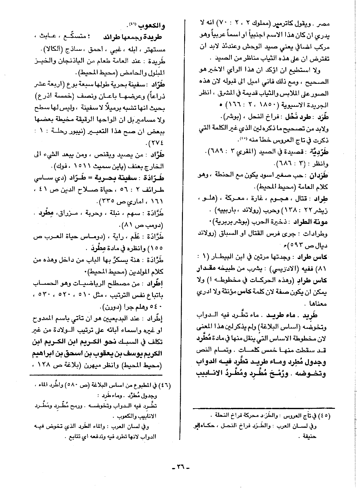 طَرّاد: سفينة بحرية طولها سبعة بوع (أربعة عشر ذراعاً) وعرضها باعان ونصف (خمسة أذرع) بحيث إنها تشبه برميلاً لا سفينة، وليس لها سطح ولا مسامير بل أن ألواحها الرقيقة مخيطة بعضها ببعض أن صح هذا التعبير (نيبور رحلة: 1: 274).