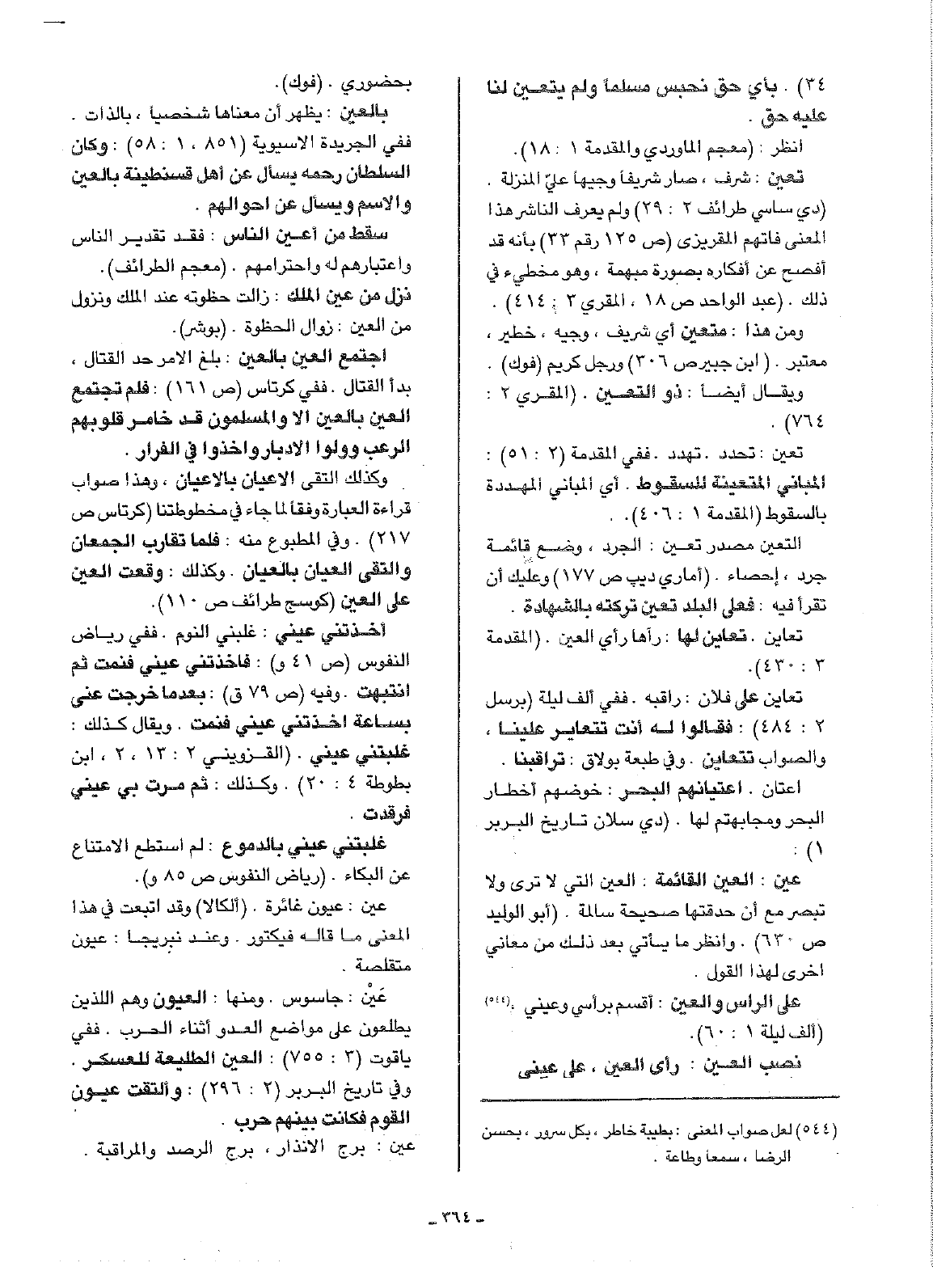 اعتان. اعتيانهم البحر: خوضهم أخطار البحر ومجابهتم لها. (دي سلان تاريخ البربر 1): عين: العين قائمة: العين التي لا ترى ولا تبصر مع أن حدقتها صحيحة سالمة. (أبو الوليد ص630). وانظر ما يأتي بعد ذلك من معاني أخرى لهذا القول.