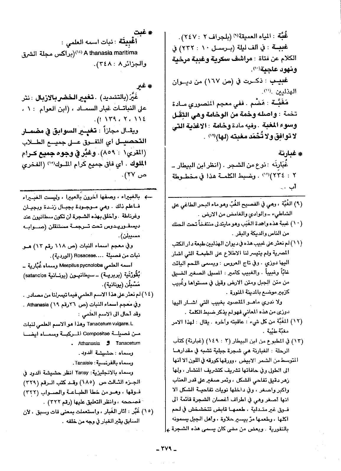 • غبارنة: غُبَارنَه: نوع من الشجر. (انظر ابن البيطار-2: 234). وضبط الكلمة هذا في مخطوطة أب.